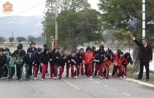 打造良好體魄、養成運動習慣,金沙國小日前辦理班際越野賽,三至六年級分組競賽,跑榮湖一圈,學子展現良好體能,力求個人及團隊榮譽,由陳啟仁、吳雅君等八人,分別抱走各組第一,贏得掌聲與獎勵。 金沙國小往年透過師生小小馬拉松賽,培養學生運動習實,或跑或走學生自行到操場報到,並且透過老師、學生相互認證,訓練同學誠實與負責,今年度九十九年下學期,辦理班際越野賽,由四至六年級學生分級分男女組競賽(身體不適者除外),跑榮湖一圈。 金沙國小校長王添泉表示,活動係依據「九十九學年度學校衛生與健康促進實施計畫辦理」,目的和小小馬拉松賽一樣,在鍛鍊學生體魄,輔導其養成運動習慣,並藉此讓個人展現體育潛能,從中瞭解在團體活動中,團隊精神的重要,學習相互合作爭取最高榮譽。 金沙國民小學99學年度下期班際越野賽,共分三至六年級男女生等八組,每組各取五名,獲個人獎勵積點嘉勉,並從中得分總和最高者評比團隊成績,頒發獎金新台幣四百元。 三至六年級學生,不分你我,在校長王添泉鳴槍下起跑,從校門出發,繞行榮湖一圈,有人臉紅氣喘,有人輕輕鬆鬆,在抵達終點時同樣為完成任務而喝采,經過一番較量,成績如后: 個人賽(取各組前五名): 六年級男生:陳啟仁、黃擎、蔡源榕、吳懿航、黃銘瀚。 六年級女生:吳雅君、蕭憶芳、黃曉彤、黃雅涵、林育如。五年級男生:蔡宸維、黃兆謙、游漢璋、張庭穎、張詠程。五年級女生:黃薇、黃嬿如、黃嘉葳、楊郁玫、許瑞瑩。 四年級男生:王昇隆、吳哲瑋、何英準、張文彥、張文威。 四年級女生:游芷凌、李亭逸、黃姿敏、王貞茹、張芸銘。 三年級男生:陳冠廷、陳緯、許紹禹、黃震瑋、陳佳陽。三年級女生:黃妤萱、黃明瑜、蔡宜穎、張嘉敏、黃懷瑢。 團體賽: 六年甲班、五年甲班、四年乙班、三年甲班。