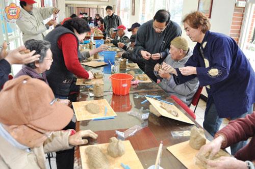 樂「陶陶」!金門縣大同之家安老組七十多位院民,昨日群聚該家一樓風雨走廊共享捏陶之樂,在浯州陶藝工作坊王明宗大師熱心教導長者捏土技巧,長輩們興高采烈專注的雕塑自己的創作,大同之家主任陳大鵬也陪著一起捏陶,期盼透過陶土塑形活動之舉辦,讓長者回憶過去童年玩泥巴的情趣,並藉由捏陶增進手部精細動作發揮想像,塑造屬於自己的陶像,也增加生活樂趣,提升自我滿足與成就。 金門縣大同之家依據「一百年長者樂陶陶」活動計畫,昨日下午邀請浯州陶藝工作坊大師王明宗前來大同之家安老組展開,並假該家一樓風雨走廊舉辦長者捏陶創作研習活動,教導長者捏土技巧及如何雕塑專屬的陶像,計有院內長者七十多位興高采烈的參加捏陶,由於難得有機會大玩泥巴,長輩們都異常興奮,大家一到會場,都忍不住在桌子上開始動手體驗與陶土接觸的快感,經王明宗老師的細心調撥指導下,長者從初級的瓷土搓揉開始學起,而替代役與工作人員也在旁協助加水捏陶,與長者一起創作陶土作品。大同之家主任陳大鵬也陪長者一起捏陶,重溫年少時光。 陳大鵬說,此次活動藉由陶土塑形,映照出長者心情,是為增進長者手眼協調力,促進精細動作靈活,經由專業師資授課,藉製陶、捏陶過程中激發創作潛能,發揮巧思,動手捏塑各種造型的作品,樂在其中,也激發學陶的興趣。 陳大鵬特別感謝指導老師王明宗熱心的指導與付出,看到長者認真學習,動手捏塑各種造型的作品可說是有模有樣,不覺莞爾,也肯定活動的效益,並將這些完成作品交由老師帶回高溫燒陶處理完成,再交還給長者,並從中挑選出優良作品,提供該家櫥櫃擺飾展出供人參觀。