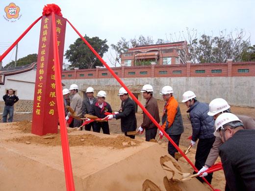 「金鍬一舉福滿地、鬼魅凶惡他處去、工程順利通富貴、社區居民展樂趣」這是來自珠山社區居民對活動中心興建的期盼,金城鎮珠沙里珠山社區活動中心昨(廿五)日舉行動土典禮,工程預定在今年底前完工,省府秘書長曾華德期盼社區活動中心完成啟用後,為社區凝聚共識,開創社區發展新里程碑,提供社區更好的休閒場所。 珠山社區活動中心新建工程動土典禮於昨日上午十時舉行,由福建省政府秘書長曾華德、金城鎮公所主任秘書黃耿銘、金城鎮代會主席陳天成、立委陳福海辦公室黃主任、珠沙里長歐贊隊及社區長老薛承助、薛水涵等人共同持鍬動土,薛氏宗親會理事長薛承琛、國家公園西區主任許丕祥與社區鄉親到場參加、觀禮。 曾華德表示,珠山是個歷史悠久的聚落,保留完整的閩南古厝、洋樓建築,擁有絕佳的地理環境,也出過許多名人,希望透過社區活動中心的興建,整合社區各項資源,發揮社區功能,凝聚社區向心力,改善居民生活環境,提升更優質的生活品質。 陳天成則期盼,今年恰逢建國百年,期盼活動中心的興建,讓珠山社區更加興旺、繁榮,並且幸福百分百。 珠山位金城鎮珠沙里西南隅的小型盆地上,龜山、雞奄山(珠山)、赤山(獅頭山)、石坑山(石紫山)環峙盆地的北、東、南、西四境。源於盆舷丘阜的溪澗,由西南、西北、東北等匯入盆內,將村中的長潭、大潭、宮橋潭、後潭仔、大章池等地潭串連成一體、村人稱「七星潭」,形成「四水歸塘、七星流穴」的陽居寶地。 鎮公所指出,經取得國有土地的撥用,珠山活動中心將興建二層樓的電梯建築物,總樓板面積為542.96平方公尺,發包工程費計新台幣853萬元整,經費來源除了有省府補助新台幣200萬元、縣府的相關補助外,薛永順、薛承琛及吳怡跑等三人,分別向縣議員許建中、許燕道、唐麗輝及歐陽儀雄爭取工程配合款計新台幣350萬元整,後續尚不足150萬餘元,社區也希望繼續爭取議員配合款的支持。 鎮公所表示,珠山社區自民國八十六年起,推動社區總體營造活動,為本縣社區營造的第一站,珠山社區曾經有過一段輝煌、繁華興盛的年代,希望透過社區活動中心的興建,整合社區各項資源,凝聚社區向心力,重現昔日繁榮的景象,改善居民生活環境,提升更優質的生活品質。
