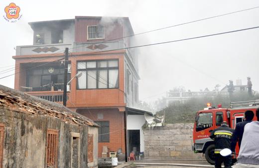 金沙鎮洋山村一處民宅昨日下午五時許發生火警,火舌及濃煙自三樓鐵皮屋內向外竄燒,七輛搶救車組一次湧進小村落,驚動村民出外圍觀,職義消合力於下午五時三十九分撲滅火勢,所幸無人傷亡。金門縣消防局第二大隊大隊長林俊表示,現場燃燒面積約五十平方公尺,屋內堆放書籍、衣物、棉被等雜物幾乎全毀,而詳細起火原因由火調課調查中。 昨日下午五時零七分,金沙消防分隊接獲勤指通報金沙鎮洋山村有民宅火警,由小隊長黃志中率隊員柯文才、陳俊源、許景輔、替代役黃世雄、呂彥旼等前往搶救。消防員表示,自遠方即可看見住宅三樓鐵皮屋,有陣陣濃煙向外流竄,抵達現場後發現有火舌向外竄,故請求金湖、金寧消防分隊車輛支援,職義消共計有林俊、周柏彰、林蔚尚、陳平、翁國寶、黃奕焮、黃奕泰、張福源、楊能輝、何紝容、蔡立賢、何有志、張再勝等二十餘人,合力於下午五時三十九分將火勢撲滅。 根據現場參與搶救人員表示,住宅三樓鐵皮屋內堆放許多衣服、書籍、棉被等雜物,應該是儲藏室,搶救過程一片漆黑並沒有發現危險物品。而陸續趕到場的二十餘位職義消,一組人力佈設水線深入起火點搶救,另外佈設一條水線從外面射水滅火,內外夾攻撲滅火勢。 現場王姓屋主表示,下午有到三樓拜拜,並未發現任何異狀;鄰居通報才知道住宅頂樓起火。而其家人也向消防人員表示,她是在樓下剝海蚵,有聞到燒焦味,但不知道是從自宅樓上冒出來的。小小村落一下子湧入七輛消防車組以及搶救人力,民眾紛紛跑出屋外一探究境。 在火場附近的住戶表示,下午五時許見到濃煙自該屋頂竄出,趕緊報案,這是這周圍兩星期以來第二場火警,社區都是老人和小孩,還好消防人員及時趕到,否則後果不堪設想。 消防局第二大隊大隊長林俊表示,該民宅火警順利於下午五時卅九分撲滅火勢,財物損失尚待估算,起火原因正由火調課調查中。籲請民眾,住宅或頂樓鐵皮屋加蓋鐵皮屋,要特別留意用電及用火安全。另外,救災現場不要圍觀,以免影響搶救工作。