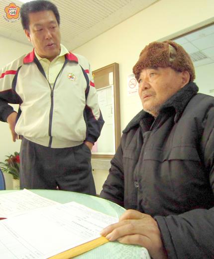 難躲的是債,難討的也是債!一位年約七十七歲的老少校趙國忠(右)到金湖鎮公所要求調解會「調解」;調解的目的是幫忙討債-要房租。 雖然鎮公所或調解委員會並不是「討債公司」,也沒有代催房租這項業務;不過,承辦人員陳志衡(左)還是幫他聯絡到了承租人。老少校聯絡不到承租人的原因之一是他把承租人電話中的兩碼給記顛倒了。 這是發生在前天(二月二十四日)的事情,由於有調解會的一通電話,對方表示當天下午就會奉還租金,並請老少校自行前往收取。 老少校原籍安徽,十四歲時,因大陸易幟而流離失所的國軍,駐紮在老家;他因為沒有長上,年紀太輕,肩不能挑,手不能提,無以為生,就隨著駐軍轉戰向南,一路上高高低低走了一個多月。 那一年,他所加入的部隊在平潭島被襲,他和二、三十位同袍划著小船,在有月無風的夜裡划向舶在海中的大型軍艦。他說,還好當時沒有風,否則船小人多,海平面幾乎與船舷一般高,風一吹船必然進水下沈。上了軍艦之後,他們被送到臺灣,接著編入劉玉章的部隊。幾度移防之後,就以金門做為第二個家鄉;最後在士校以少校隊長退役。 趙國忠之所以在金門落地生根,是因為娶了金門姑娘。他的太太是個瘖啞女子。當年,他以為要結婚的對象「不會說話」是指「不會說國語」;不過,姻緣天註定,兩人還是白頭偕老以至於今。 趙國忠在金湖鎮安民村有一棟瓦房,租出去約五次,每次簽約兩年。按合約,租金每月十日收取;不過,他覺得收租金收得有點困難,因此才找上金湖調解會。他表示,租金最久曾被拖十個月;這次大概拖了十多天。 俗話說「怕見的是怪,難躲的是債」;為了討債,老少校只好請調解會出面,不管承租人是否見怪了。