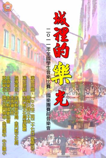 一項由金門縣教育局、金門縣文化局、金城鎮公所主辦的「城裡的樂光」國樂音樂會(見下圖),將於明(二十七)日晚間假文化局演藝廳舉辦,金門高中、金城國中、中正國小三校國樂團登場演出,歡迎鄉親前往聆賞和鼓勵、加油,為金門爭榮譽。 金門國樂團預定於三月初赴台參加99學年度全國學生音樂比賽賽前音樂會,參賽的金門高中、金城國中、中正國小三校國樂團赴台參賽前,明日晚間七時三十分假於文化局演藝廳舉行「城裡的樂光」國樂音樂會,期讓鄉親提前能感受美妙的音樂饗宴。 這次,金中、城中、中正三校國樂團均參加室內絲竹團及團體合奏,期待能再有好的成績。金中國樂團將演出留傘調、絲竹新韻、彩絮飛揚,及由盧亮輝老師編曲的「粵韻風華第一、三樂章」;城中國樂團演出的曲目為騎著毛驢去趕集、層疊、酒歌,及由蘇文慶老師為金門譜的「風獅爺傳奇」。