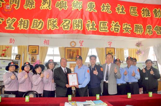 金門縣政府推動「社區治安工作績優社區專案競賽計畫」評核,烈嶼鄉東坑社區巡守隊所屬的巡守、防暴、救災、防疫、扶弱等小組,以具體的作為和成果,獲得縣府評為全縣第一名,烈嶼鄉長洪成發與有榮焉,也特別贈送紅包及獎狀,期許作為烈嶼各社區學習的模範。 洪成發很歡喜東坑社區巡守隊又獲得全縣性第一名的榮譽,在縣政府還沒有表揚前,鄉公所先行獎勵,由鄉長洪成發帶著鄉公所秘書呂合成到東坑社區為巡守隊隊員打氣,受到該巡守隊副隊長呂清河、巡守、防暴、救災、防疫、扶弱等小組小組長呂玉環、洪國泰、郭玉梅、呂俊龍、組員牛海紅、林永市、呂國卿等人的歡迎。 洪成發帶來鄉公所頒發的榮譽獎狀以及紅包,肯定巡守隊團隊犧牲個人時間投入社區治安的努力成果。洪成發說,縣府推動的這項社區治安評核,包括有,烈嶼東坑社區、金城南門社區、庵前社區、金湖新頭林兜社區、金沙忠孝新村等社區接受考核,東坑社區以執行社區治安工作的作為以及成果,獲得評核委員的肯定,評以第一名最優異的成績,這不僅是該社區居民的榮譽,也是烈嶼鄉的榮譽。 洪成發說,東坑社區在社區環保、治安維護等工作,都有亮麗的成績,曾榮獲「全國治安標竿社區」、「全國環境保護模範社區」等全國性大獎的殊榮。洪成發期望該社區作為其它社區的模範,讓烈嶼有更多如同東坑巡守隊一樣的發揮組織功能,協助警方維護社區的治安,提供居民安全的生活環境。 縣警察局烈嶼分駐所所長王得志表示,東坑社區於91年成立守望相助巡守隊,原由30人編組而成,到目前增加為39人,組織健全,包括巡守、防暴、救災、防疫、扶弱等小組。他說,該巡守隊不論是在平時或春安期間,均能加強社區安全維護工作,依社區狀況投入服務工作,如保護婦幼安全、訪視獨居長者等,以彌補警力運作之空隙,建構社區治安維護協防網絡,而隊員伙伴們在執行巡邏時發現犯罪徵候情事,立即通報警方人員處置,發揮守望相助的組織功能。 王得志指出,東坑社區居民的守望相助工作,做的很落實,曾發生遊客到社區臨時起意,偷竊社區公物,遊客還沒有回到大金門,社區守望隊在第一時間通知警方,迅速在九宮碼頭逮到竊賊。該社區還有很多維護治安的作為,包括,編組幹部施予訓練,配賦治安裝備,以強化社區自我防衛能力;治安地圖的繪製,就轄區易發生滋事處所,調查分析,找出治安死角,繪製治安地圖,統籌劃設治安區塊認養,擴大值勤範圍;組成治安工作小組,實施任務分工,分別賦予敦親睦鄰、檢舉走私、防止犯罪、警民合作等4大要務;社區治安區塊認養,擴大執勤範圍區塊,全天候實施,編組人員相互支援,一旦發現有可疑人物,隨時電話告知烈嶼分駐所處理;配合烈嶼分駐所執勤相關事務,落實推動巡守工作與分駐所勤務互相結合;劃設校園安心走廊,結合學校、分駐所,建構校外安全網絡,維護學童上下學安全;建立113婦幼保護專線,隨時即刻通報協助解決,緊急救援受虐兒童及家庭處遇服務相關問題,以確保兒少身心獲得健全發展,平安快樂成長;發行社區治安報導,期刊編撰,社區治安、社區營造、關懷家園、推動各項等活動,社區訊息報導特刊,分送各戶居民知曉,達到訊息交流。