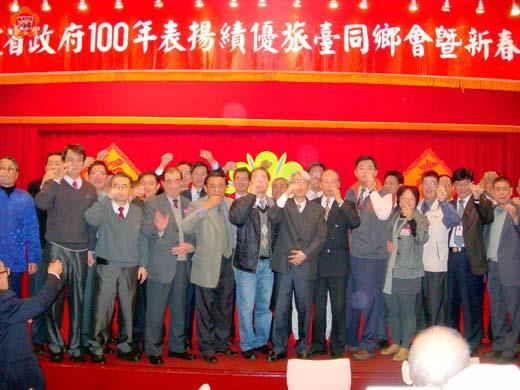 福建省政府團隊昨在台舉行新春團拜,並辦理100年表揚績優旅台同鄉會(社)及個人活動,省主席薛承泰頒發了14個金、馬旅台績優團體,94位績優個人,並感謝受獎單位與個人過去一年對鄉親的付出與貢獻。 福建省政府100年表揚旅台同鄉會(社)績優團體(各頒發獎牌乙面)包括: 臺北市晉江同鄉會、臺北市上杭同鄉會、高雄市金門同鄉會、桃園縣金馬離島文教協會、臺中縣褔州十縣同鄉會、臺中市褔州十縣同鄉會、臺中市閩南同鄉會、臺中市惠安同鄉會、臺中市金門同鄉會、南投縣褔建同鄉會、屏東縣福建同鄉會、宜蘭縣閩南同鄉會、高雄縣金門同鄉會、中華民國褔建省長樂市同鄉總會等14個績優團體。 而受表揚的旅臺同鄉會(社)績優個人(共94位,各頒發獎狀乙幀),分別為: 臺北市閩北同鄉會理事龔芳書、臺北市閩北同鄉會理事蔡英明、臺北褔州十邑同鄉會會員曹雲龍、臺北褔州十邑同鄉會會員林政良、臺北市長樂同鄉會理事長陳金龍、臺北市連江同鄉會常務理事林起潛、臺北市連江同鄉會理事賀朝陽、臺北市福清同鄉會理事陳宜達、臺北市平潭同鄉會理事林傳彬、臺北市龍岩同鄉會常務理事黃強、臺北市龍岩同鄉會監事張慶雄、臺北市武平同鄉會理事練金澆、臺北市武平同鄉會理事劉南林、臺北市永定同鄉會會員賴曼?、臺北市永定同鄉會會員盧衍祺、臺北市永春同鄉會名譽理事長陳銀枝、臺北市安溪同鄉會常務理事林清溪、臺北市安溪同鄉會總幹事蔡青雲、臺北市晉江同鄉會理事長陳介山、臺北市晉江同鄉會會員蔡清淵、臺北市金門同鄉會理事王先黎、臺北市莆仙同鄉會常務理事黃典本、臺北市平和同鄉會理事曾一塵、臺北市詔安同鄉會理事長吳清音、臺北市詔安同鄉會理事長沈大斌、臺北市同安同鄉會會員陳甘霖、臺北市同安同鄉會理事張美玉、臺北市南安同鄉會常務理事陳守仁、臺北市上杭同鄉會理事長周德光、臺北市東山同鄉會監事李美玉、南投縣褔建同鄉會總幹事楊旭輝、雲林縣褔州十一縣市同鄉會理事郭元旦、雲林縣閩南同鄉會常務理事黃文通、臺南市閩南同鄉會常務理事林士楷、臺南縣金門同鄉會理事長洪永成、臺南縣金門同鄉會常務監事陳文泉、臺南市金門同鄉會理事蔡世瑞、臺南市汀州八縣同鄉會會員鄭文英。 高雄縣福建同鄉會常務理事林良忠、高雄縣金門同鄉會理事陳文欽、屏東縣褔建同鄉會理事蘇清河、宜蘭縣福州同鄉會總幹事林梅魂、宜蘭縣閩南同鄉會常務理事張日隆、宜蘭縣閩南同鄉會理事陳瑞源、花蓮縣福州同鄉會常務理事馬天官、花蓮縣莆仙同鄉會理事郭杏孫、花蓮縣閩南同鄉會理事柯承安、花蓮縣金門同鄉會創會理事長王壽宣、花蓮縣金門同鄉會會員薛國才、臺東縣褔州十一縣市同鄉會理事鄭端、中華民國褔建省長樂市同鄉總會監事主席劉其飛、中華民國馬祖文教協會副理事長陳嘉和、中華民國馬祖文教協會財務主任陳令興、中華民國烈嶼公共事務協會理事林金仁、中華民國烈嶼公共事務協會處長楊勝利、中華民國金門雙鯉公共事務會理事李錫敏、高雄市福建同鄉會常務理事葉碩仁、高雄市福建同鄉會監事莊晚基、高雄市閩南同鄉會理事林守道、高雄市閩南同鄉會理事洪貞雄、高雄市南安同鄉會理事鄭彥竹、高雄市南安同鄉會理事伍地、高雄市泉州晉江同鄉會副理事長顏順富、高雄市泉州晉江同鄉會常務理事顏瑜瑛、高雄市平和同鄉會理事曾于壹、高雄市金門同鄉會理事李士豪、高雄市金門同鄉會理事許清練、高雄市東山同鄉會志工朱永木、高雄市東山同鄉會理事林鴻彬。 基隆市莆仙同鄉會理事鄒明榮、基隆市莆仙同鄉會監事陳阿興、基隆市閩南同鄉會總幹事江純仁、新北市金門同鄉會副理事長陳永東、新北市金門同鄉會常務理事鄭秀貞、臺北縣土城市連江縣同鄉會理事曹英仙、桃園縣金馬文教協會總幹事陳再旺、桃園縣金馬文教協會理事王成泉、桃園縣馬祖同鄉會理事陳嬌香、桃園縣馬祖同鄉會理事陳學和、桃園縣金門同鄉會理事陳森材、桃園縣金門同鄉會幹事陳國成、臺中縣褔州十縣同鄉會理事吳凌岳、臺中市閩南同鄉會理事汪淳、臺中市惠安同鄉會理事王美珠、臺中縣金門同鄉會常務理事黃安順、臺中市金門同鄉會總幹事黃玉琍、臺中市褔州十縣同鄉會理事方偉中、南投縣褔建同鄉會總幹事楊旭輝、雲林縣褔州十一縣市同鄉會理事郭元旦、雲林縣閩南同鄉會常務理事黃文通。 臺南市閩南同鄉會常務理事林士楷、臺南縣金門同鄉會理事長洪永成、臺南縣金門同鄉會常務監事陳文泉、臺南市金門同鄉會理事蔡世瑞、臺南市汀州八縣同鄉會會員鄭文英、高雄市皆德基金會理事董宇舜、高雄市皆德基金會理事陳瑞霖、臺北市閩北同鄉會獎助學基金會常務理事蔡龍豪、臺北市國術會理事長黃鯤忠、中華金門同鄉會常務監事黃獻平、中華金門同鄉會常務理事黃平璋、中華金門旅臺公共事務協進會理事長黃炳中。