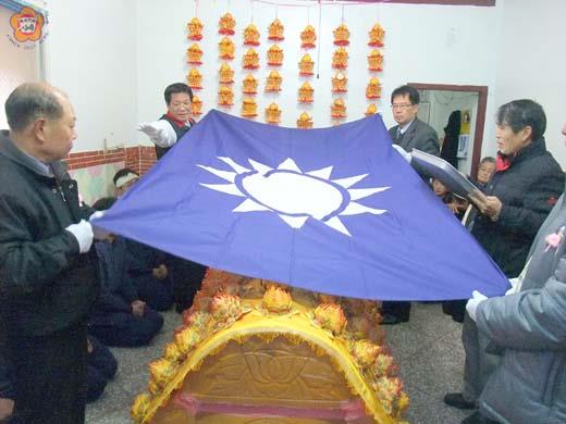 中國國民黨日昨為已故老黨員黃清讚覆蓋黨旗,黃清讚享壽八十二歲,入黨超過六十餘載,金門縣委員會主任委員黃原亮特別代表黨主席馬英九頒發家屬覆旗證書,儀式莊嚴隆重。 日昨的覆蓋黨旗儀式是由金門縣黨部主任委員黃原亮擔任主祭,覆旗委員除了黃原亮之外,還有金城鎮長石兆日、張延壽、許志明、黃國龍(金門縣黃氏宗親會理事長)等人。 在覆蓋黨旗儀式中,也特別宣讀黨主席馬英九署名的覆旗證書,內容如下:「黃清讚同志生前忠黨愛國,信仰三民主義,對黨務工作著有功績,特予黨旗覆棺,並頒證書以資矜式。」 據黃清讚的姪子、也是縣府秘書黃錫安表示,他的叔叔(黃清讚)平生熱愛桑梓,熱心服務鄉里,頗受鄉親愛戴,他為人耿直,頗孚眾望;此外,忠黨愛國的他,加入國民黨已超過一甲子,常常教育子孫忠黨愛國的思想,也多方提攜後輩,是位相當令人尊敬的長輩。 黃錫安說,黃清讚育有四子三女,子孫都相當有發展與成就,大兒子目前在金門電力公司服務、二兒子在東元電機的大陸廠擔任研發執行長、三兒子是永豐餘造紙廠的廠長、四兒子擔任康舒公司董事長特助,至於女兒們也分別在縣府的民政局與社會局服務。 議員許華玉對這位一路看著她從政的叔叔也相當感念,她說,當初她選舉失利時,叔叔跟她一樣感到難過,不時的安慰她、鼓勵她,後來得知她敗部復活,得以遞補接任議員,也為她感到高興,她哽咽的說,很遺憾叔叔在大年初六就過世了,無法參加她的就職典禮,讓她感到相當遺憾。 許華玉說,叔叔常常鼓勵她要積極的服務鄉親、為民喉舌,未來她也會秉持叔叔的遺志,好好做好為民服務的工作,她也相信叔叔會在天上保佑、支持著她。