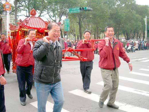 新北市永和區「八二三紀念公園」附近街道,昨天上午鑼鼓喧天,鞭炮聲不斷,有一支長隊迎神遶境巡安隊伍,吸引住家與遊客駐足圍觀,原來是數百位金門旅台李氏宗親扛著「李氏開閩始祖唐廉訪五州節度使隴西開國公五山祖」的聖輦,浩浩蕩蕩的舉行新春迎爐遶境祈安活動。金門縣長李沃士也賣力的「扛輦」,表達對五山祖的崇敬。 這種熱鬧遶境的場面,去年此時(農曆正月十六日)也在該處上演一次。因為去年是住在永和區民權路的李氏宗親李文硯擲筊,獲得「五山祖」首肯,將始祖神像及神爐迎回住處供奉。 去年農曆十月初十日,旅台李氏宗親循例於三重區的祖厝,遵循古禮,由宗親以擲筊方式,選出輪值新爐主。結果由李文硯「連莊」再任爐主。 旅台李氏宗親固定於農曆正月十六日舉行新爐主迎爐,及五山祖遶境巡安,是旅台李氏宗親的年度大事,台灣北區的李氏宗親有人年年參加,中南部也有不少李氏宗親趕到台北來參與盛會。 昨天上午九時,先在三重區李氏祖厝由李氏宗親會理事長李增得與爐主李文硯主持祭祖與爐主交接儀式,然後大隊人馬轉往永和區「八二三紀念公園」集合後,舉行遶境祈安活動。 遶境隊伍有台灣迎神隊伍中少見的大旗陣,並由三太子爺神輦神氣領隊,綿延一、二百公尺的隊伍,敲鑼打鼓、鞭炮震天響的遊行朝李文硯住處前去,熱鬧的場面,引來不少人圍觀。縣長李沃士趕早班機趕去參與宗親盛會,他還脫掉外套,參與「扛輦」。 隨後,李氏宗親在李文硯宅舉行古禮拜祖儀式,李縣長虔誠跪拜並奉獻爐敬金。 連任爐主的李文硯興高采烈,特設午宴招待鄉親。李氏宗親並舉行新春團拜。