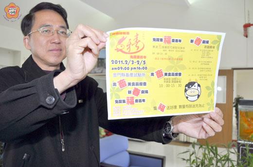 百年蟹鱟迎玉兔!金門縣水產試驗所一百年春節農業展系列活動昨天在莒光湖畔登場,由金門縣政府主任秘書盧志輝主持開鑼儀式,為一連三天的歡慶春節活動揭開序幕,盧志輝歡迎鄉親在春節新年期間,闔家出外走走,前往參觀農業展和踏青,過一個道地的「金門年」,並祝福全體鄉親揚眉吐氣,兔年行大運! 金門水試所歡慶春節農業展系列活動開鑼儀式,昨天上午九時三十分舉行,邀請花蛤仙子李依文擔任節目表演主持人;在開鑼儀式中,盧志輝敲第一聲鑼響:祝鄉親玉兔迎春慶有餘、第二聲鑼響祝縣運昌隆造鄉里、第三鑼響祝國運昌隆萬民享;而且,現場有祥獅獻瑞,祝大家漁豐滿載,年年有魚! 在昨天農曆春節大年初一,許許多多的鄉親來到莒光湖畔參加水試所百年春節農業發展表演活動,盧志輝代表縣長歡迎鄉親的熱情參與,並感謝水試所全體員工的努力,提供鄉親及遊客春節期間有一個休閒遊憩的好去處;而且,他希望鄉親在春節過年期間,闔家出外踏青,前往各地參觀農業展,並迎接春回大地,過一個道地的「金門年」,歡樂又喜氣洋洋。 金門水試所春節農業展系列活動從昨天大年初一起至大年初三的活動內容有縣長盃釣魚賽、台灣魔術秀、中東肚皮舞、台金歌手同台獻藝…,炒熱過年歡樂氣氛,也向鄉親拜年和祝賀「新年有魚」,並且宣導環境生態保育觀念,以及創造整體消費,帶動觀光人潮,以達歡樂與教育雙重效果。 記者楊水詠/綜合報導 農曆辛卯年春節出外走春,闔家或是三五好友結伴到尚義環保公園乘坐遊園車,體驗低碳樂活節能行,以及尋找風獅爺拿最夯的兔年燈籠,還有新春遊園禮,金門縣環保局在昨日大年初一帶給入園的大人和小孩一個環保、健康又歡樂的新年,並祝賀大家金兔吉祥,百年如意! 環保局的「節能減碳迎兔年、環保公園歡新春」活動從大年初一起至大年初三(每天上午九時至十二時,下午二時至五時)舉辦。