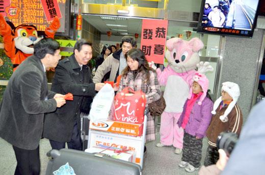 小年夜,歡迎鄉親返鄉過年,金門航空站主任洪念慈與立委陳福海昨天在金門航空站入境大廳舉辦「送虎迎兔慶團圓」活動,敲鑼打鼓送福袋,慶祝去年運量突破209萬人次,為設站以來單年旅客運量最高紀錄。 金門航空站去年旅客進出為209萬4623人次,創下民國83年設站以來,單年旅客運量最高紀錄。為慶祝運量創新高及實施春運,金門航空站昨起一連兩天舉辦「送虎迎兔慶團圓」活動,昨由正義國小、柏村國小學生在入境大廳,進行表演慶祝活動;今天2月2日上午10-12時由中正國小、下午2-4時由古城國小的小朋友擔崗演出鑼鼓陣等民俗遊藝節目,預先炒熱春節氣氛。 洪念慈昨日上午會同縣籍立委陳福海在航站入境大廳,分送內裝巧克力金幣的福袋給返鄉過年鄉親,向鄉親拜早年,分享過年喜氣。活動中也安排可愛的老虎與免子布偶及穿扮兔子帽的工作人員串場表演,並與現場的大朋友、小朋友互動合影,充滿年味,洋溢喜氣。 金門航空站表示,春節前疏運重點為由台灣返鄉至金門過年的旅台鄉親,春節後重點則是回到台灣上班、上學的旅客;為維持疏運秩序,6日至8日開設聯合補位單一窗口,提供便捷的補位服務。