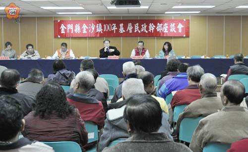 金門縣政府一百年基層民政幹部座談昨日在金沙鎮舉行,縣長李沃士率縣府團隊列席傾聽基層心聲,縣議員蔡春生、楊應雄也列席。民眾聚焦農政、水資源、交通建設、醫療及土地地籍等議題。李縣長表示,金門整體發展,有賴地方和中央一起努力,縣府除積極爭取中央支持外,盼鄉親用長遠眼光來看待整體建設發展,切莫因小失大,才能創造地方長久福利。 金門縣金沙鎮一百年基層民政幹部座談會,昨日下午四時起假金沙鎮公所三樓舉行,縣長李沃士率縣府團隊列席參加,縣議員蔡春生、楊應雄、金沙鎮鎮長陳昆第、金沙鎮民代表會主席王秀玉、副主席吳有家、代表黃聰成、蔡寶愛、里長陳金德、楊恭勤、黃志明、李賢慨、周家才、張瀚龍、吳有泰以及調解委員,鄰長和鎮公所團隊出席與會,就地方建設大小事提出建言。 會中,首先由縣府各課室主管進行業務說明,民政局局長翁伸金表示,八二三照顧津貼,在縣長積極推動和議會支持,目前依程序送中央核備;未來縣府將成立一九九九諮詢專線。教育局局長李再杭表示,金門大學、銘傳大學一百年新學期將招收陸生。文化局局長李錫隆表示,文化園區歷史民俗博物館已開館,歡迎鄉親踴躍參與。縣長李沃士也補充說明,期盼能夠邀請鄉親春節到文化園區喝咖啡賞文物。工務局局長許鴻志說明,金沙鎮碧山聚落正執行營建署競爭型計劃,未來鄉親可一睹建設成果;而目前地區污水改善已進入第三期,九十九年至一百○四年,中央投入十餘億經費,完成後可達百分之五十接管率,屆時也需要基層協助配合。 建設局局長葉媚媚說明,縣府積極招商引資,增加就業及地方稅收。金沙斗門一帶有十餘公頃地將打造成為綠色產能專區。農曆春節將屆擴大辦理新春農業展,歡迎鄉親逗陣參與。 交通旅遊局專員楊鎮浯也說明,縣長積極向中央爭取春運最佳疏運運能。活動主題將擴及東半島,獅山砲陣地春節將局部開放,未來並結合文化村規劃為大山后旅遊帶。 地政局局長林德恭也表示,軍管時期徵用土地,民國一百○三年可申請購回,今年四月份起地政局週三有窗口提供服務,沿海地雷區土地縣府爭取離島建設條例,若修法通過將受理土地所有權補登記。社會局局長方天吉說明全職媽媽補助延長至五歲;中低收入戶補助提升等福利措施。消防局副局長王世祿表示,全縣進行消防通道劃設以便利災害之搶救,另外將籌設一一九來電顯示住址,便利災害通報。環保局課長林怡種指出,金門是我家整潔靠大家,環保局有二十四小時檢舉專線0800056580將馬上派員處理。今年春節環保公園也納入景點參觀,內有六十四尊風獅爺,歡迎參觀。 陳天順也表示,金門醫療大樓興建中,整體醫療水平未到位前,金門縣衛生局將有兩位服務員在署立金門醫院一樓提供服務;今年起轉診交通費補助擴及陪同家屬,金好康健康檢查滿三十即可受檢,金沙鎮衛生所將爭取興建新衛生所大樓,提供更好空間。 基層幹部王鈺筑、王雙福等民眾反映,民生用水、農路建設、土地所有權、就醫等需求;陳文傑說,太武社區道路因工程導致路不平,建議美化恢復原貌。鎮代表應縮小選區範圍改以里為選區,里長和代表結合服務才能到位。 陳天平說,金門在選舉時,從未有人將擴大道路建設納為政見,而縣府要發展五星級飯店無五星級道路如何行之,金門要發展需要有寬廣道路,建議納入參選政見。金沙鎮代表黃奕焮建議,鄰里長赴台觀摩經費,一百年用追加減預算恢復。而金沙地區子弟參加高中學校晚自習(最晚班七點五十分金城發車)卻無公車返家,各鄉鎮時間有差異建請協助;另外,土地徵收購回事宜,盼縣府改善。吳文言說明,陽翟至西山前道路擴寬,建議五年得到的回覆是,車流量不多,而每每卻是車輛常常掉入壕溝的景象,盼能獲得改善。 金沙鎮代表會副主席吳有家表示,沙美鄉親和大家繳一樣的水費,卻還要另外花錢買水,建議在整體水質未改善前可否爭取免費;金嶝大橋對金沙建設有十足幫助,盼縣長多向中央發聲;現行道路如環島東路等均太狹窄,發展休閒旅遊,上道十分危險。 里長楊恭勤則製作海報反映民眾心聲,他表示,希望縣府能夠責成建設局讓電信發射台(基地台)遠離住宅區,讓民眾免於恐懼自由;官嶼里里公所設有供水站,只是上下坡度落差高,民眾取水不易,盼能改善,讓里民喝好水。 而關於基層會中建議,金門縣政府、金沙鎮鎮公所團隊就各議題提出回覆,後續將協助改善。議員楊應雄表示,新團隊建國百年新氣象,文化園區活化、金沙網球場啟用等縣府成功邁進,七分鼓勵三分期待,盼縣府團隊積極努力為地方爭取人潮,在水、電、路方面多充實,整體才會進步。 縣長李沃士表示,今年在中央支持下,為金門帶來新的機會,各項重大建設正著手推動中,也感謝議員支持,讓九十九年施政建設順暢。其中,要特別感謝第一線基層幹部協助政府政策推動,期盼鄉親用更宏觀的角色,思考整體經費及建設發展,眼光要放遠,以圖長久之福利;期待透過溝通傳達意見,作為縣府施政不足之參照並改善,祝鎮務推動順利,鄉親吉祥平安。