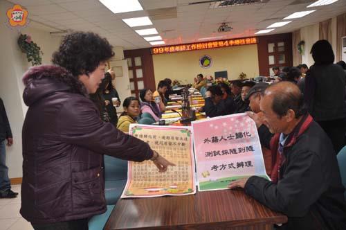 迎接建國百年,金門縣政府民政局戶政課推動新的戶政便民措施,外籍人士「歸化取得我國國籍者基本語言能力及國民權利義務基本常識測試」,採隨到隨考,方便外籍人士就近到各鄉鎮戶政所接受測試。 縣府民政局戶政課課員李愛蓮、辦事員黃月意,昨日下午帶著該項新便民措施的宣導資料,過海到烈嶼鄉公所、戶政所等單位做宣導。 李愛蓮等人利用鄉公所召開的年終工作檢討會暨第四季鄉務會議,向在場的村長、村幹事以及鄉公所員工進行宣導,希望透由他們的協助宣導,讓這項歸化我國國籍採「隨到隨考」方式的新措施,下達到各村落,來達到宣導的效益。 李愛蓮說明外籍人士歸化我國國籍,現行作業方式,本縣係依「歸化取得我國籍者基本語言能力及國民權利義務基本常識認定標準」第8條:「得視案件數量於每年1月、4月、7月、11月辦理1次」之規定,外籍人士參加歸化測試者,於各戶政事務所辦理報名後,再到縣政府參加測試。 李愛蓮表示,為提昇服務品質,加強便民服務,特簡化現行作業,採「隨到隨考」方式,由戶政事務所受理報名後,即於各該所辦理歸化測試,成績單並於測試當日核發(但以客語或原住民語言應試者,需函轉內政部、原住民委員會協助,因此需擇日辦理)。 李愛蓮說,該項方便外籍人士歸化我國國籍測試的新措施,已經上路,外籍人士可隨時到就近的戶政所接受測試,若成績未能過關,也不會限制時間、又不限次數,採「隨到隨考」方式,提供外籍人士更方便的服務。 李愛蓮等人也和烈嶼戶政所主任周清國及戶政人員就該項新措施做意見交流,希望基層戶政單位加強宣導,讓外籍人士(外籍配偶)多利用縣府推動的新戶政便民服務。