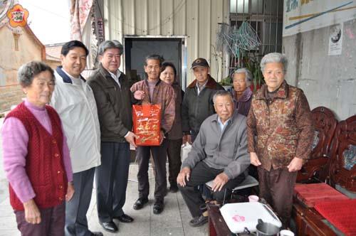 農曆新年即將到來,縣長李沃士為對低收入戶及老人團體表達關懷心意,特別在年節前指示社會局局長方天吉代表前抵金寧鄉等鄉鎮展開春節慰問活動,贈送低收入戶每戶慰問金,各老人團體致贈茶葉各四包,提前祝賀佳節快樂。 這項慰問活動,因縣長李沃士公務繁忙,不克一一親自下鄉慰問,特別指示社會局局長方天吉代表李縣長前往慰問低收入戶及老人團體表達縣府關懷,並獻上佳節的祝福。 昨日下午展開春節慰問活動,第一站首先前往金寧鄉,由社會局局長方天吉帶領社福課課長許美鳳及金門縣政府服務中心金寧區李增遨等前往,金寧鄉長陳成勇、秘書傅仰鑫、社會課長蔡世舜等人陪同,逐戶走訪探慰各低收入戶共32戶及老人團體10個,並贈送低收入戶每戶慰問金及大白菜禮盒,各老人團體包括有榜林老人休閒中心與后湖、安岐、湖峰、四埔等社區發展協會附設長春俱樂部及盤山村、后盤山、西浦頭、湖峰、湖下車站等老人會也致贈茶葉各四包,提前祝賀佳節快樂。今明兩天仍將繼續慰問其他鄉鎮,方局長均轉達縣長李沃士關懷慰問之意,並祝賀佳節快樂。