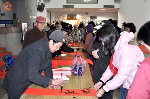 迎接辛卯兔年新春到來!金門縣文化局昨日舉辦「2011迎春名家揮毫寫春聯大方送」活動,由金門縣書法學會理事長洪明燦、常務監事陳炳仁帶領該協會書法大師總動員,一天下來書寫將近三千幅春聯免費贈送,吸引不少鄉親前往排隊索取名家所寫的春聯帶回家張貼,感受一下喜氣洋洋的「年味」。 農曆新年腳步近了,各家戶在年節到來都會張貼春聯應景,為擴大服務層面,金門縣文化局昨日上午九時起在一樓大廳辦理2011迎春名家揮毫寫春聯活動,邀請金門縣書法學會會員三十多人揮毫寫春聯,現場墨香四溢,吸引許多民眾前往排隊索取,春聯供不應求,也讓各位書法家寫到手軟,但大紅的春聯鋪滿大廳,也讓人感受到新春年味越來越濃了! 金門縣書法學會在理事長洪明燦、常務監事陳炳仁帶領下,該協會書法大師紛抵現場揮毫,各書法家獨樹一格,楷書、隸書、草書、行書等,或行雲流水、或氣勢磅石薄,各樹一格,變化萬千,將中國人引以為傲的書法藝術發揮得淋漓盡致。民眾索取待晾乾的大紅春聯鋪滿文化局大廳的地上,也讓人感受到新春年味越來越濃了!一天下來,書寫三千副的春聯被索取一空,頗有洛陽紙貴的態勢。