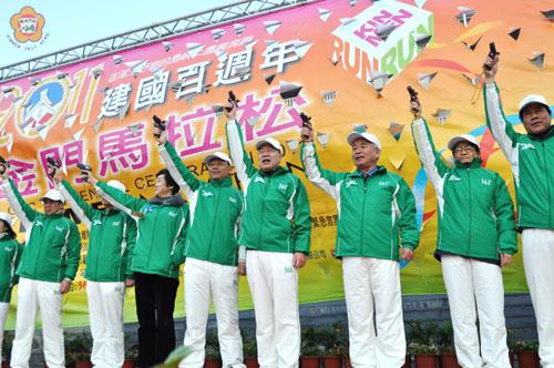 2011金門馬拉松賽昨天假國立金門大學隆重登場,一萬七千多名選手不懼冷氣團來襲參加,縣長李沃士在開幕式中感謝過去許多相關單位給予支持以及選手熱情的參與,活動才能逐步推展到今天這項規模。同時祝福所有選手在這項賽事都能逐年突破自己的成績開創顛峰,並相約選手們明年再來,讓金門馬拉松愈辦愈火紅。 縣長李沃士一大早看見與會選手與鄉親不畏低溫,齊聚在金門大學,李縣長看到選手在低溫下還熱情如火,非常感動並下場與選手問候歡迎。 2011金門馬拉松賽昨天清晨八時在國立金門大學舉行開幕典禮,活動由縣長李沃士主持,縣議會議長王再生、體委會國際處副處長江秀聰、廈門市副市長臧杰斌、中國國民黨秘書長金溥聰、文化傳播委員會主任委員蘇俊賓、金酒公司董事長李清正、金管處副處長盧淑妃、福建省政府組長張金成、立委陳福海辦公室黃主任、縣府主任秘書盧志輝、教育局長李再杭、金門大學校長李金振、路跑協會副理事長郭國雄、維他露公司副總莊政祿、廈門廣電集團副總裁鄧小林、金寧鄉長陳成勇、金湖鎮長蔡西湖、金城代表會主席陳天成及各國中小校長等來賓及來自14個國家與地區選手到場參與開幕。 開幕典禮中,李沃士感謝今天舉辦的馬拉松賽事,在過去許多相關單位給予支持,包括中華民國路跑協會、廈門市政府、廈門廣電集團以及維他露公司等單位的支持,以及所有選手熱情的參與,活動才能逐步推展到今天這項規模,也祝福所有選手在這項賽事都能逐年突破自己的成績開創顛峰。 李沃士指出,金門馬拉松是我們所引以為傲的一項休閒活動,今天有許多貴賓從遙遠地方來參與,我們也可看到金門馬拉松賽事已經受到世界的矚目,縣府也承諾一定把馬拉松賽事辦得一年比一年更好,歡迎各位繼續參與活動。他說,金門會因各位之蒞臨而更感光彩,我們今天的活動會因各位的支持辦得更加有活力,也祝福所有選手在這項賽事都能逐年突破自己的成績開創顛峰。金門是處好山好水有好酒的地方,也祝福大家在這趟比賽能有很好成績,也希望能好好享受金門的小吃美食、特產,同時走訪瀏覽金門景色的美,期盼能在各位心中留下完美的記憶與回憶,同時相約明年活動金門見,跑出好成績,更重要是把親朋好友也呼朋引伴迎接到金門來共襄盛舉。 體委會國際處副處長江秀聰表示,非常感動這麼冷的天氣大家都來參與活動,這表示大家身心都很健康,並表示德國人一天的開始就是運動,德國的學生只要參與運動學業成績都很好,藉此與大家分享勉勵,養成用運動來開始一天的生活態度。也歡迎國內外選手來參加這次盛會,並感謝承辦單位努力付出的辛勞,同時感謝廠商贊助經費讓活動能順利圓滿完成。同時希望參與選手締造良好成績,並能瀏覽金門美好景色,同時都買些金門特產當伴手禮。 議長王再生除感謝大家頂著冷冽天氣踴躍參與百年第一次活動,今年許多活動也陸續在舉辦,這些活動多得感謝承辦單位與贊助廠商的支持來舉辦,透過活動讓金門跨越出去,讓金門走向世界、走向兩岸。 廈門市副市長臧杰斌指出,今天天氣好冷、風很大,但大家的心很暖,也祝福選手能跑出好成績,活動能圓滿完成。並說,廈門金門門對門,在體育、文化、教育等方面都有很好合作,這次馬拉松就是金廈體育活動合作,明年廈門也將舉辦十周年馬拉松賽事,歡迎大家踴躍參與。