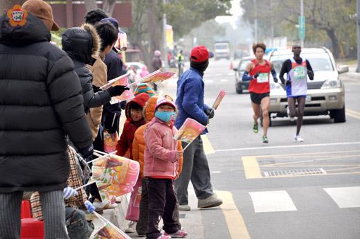 張建騰/圖文 黑的快?白的快? 金湖鎮昨天出動一千五百三十五人為馬拉松選手加油。幾位齒白脣紅的小朋友在路邊搖旗吶喊,彼此還爭論著。一個說:黑的比較快;另一個說:白的比較快!其他人也加入口舌之爭,大有不惜脣焦舌敝的態勢。