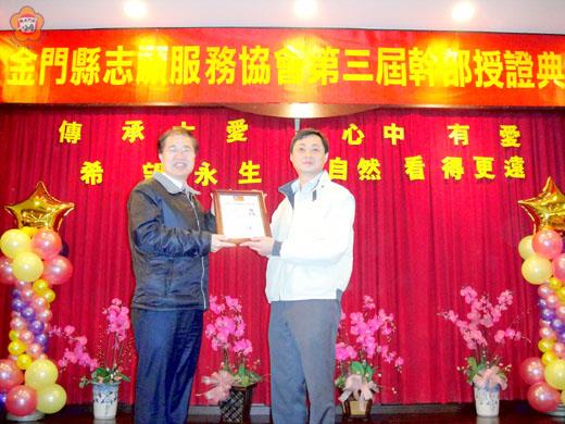 金門縣志願服務協會第三屆理監事授證暨新春會員摸彩聯誼餐會昨日舉行,府會首長到場祝賀,縣長李沃士應邀頒發理事長證書予歐陽儀雄及各理監事幹部,期許志工們繼續秉持「施比受更有福、予比取更快樂」的理念,貢獻一己之力,讓受助者因志工的付出而圓滿,促使社會風氣更祥和。 該項活動於昨日中午十二時舉行,由理事長歐陽儀雄主持,福建省政府主席薛承泰、金門縣長李沃士、金門縣議會議長王再生、議員楊應雄、唐麗輝、許燕道、金寧鄉長陳成勇、金城鎮長石兆瑉、金城鎮代表會主席陳天成到場表達賀意。該會卸任理事長陳媽愛和各鄉鎮分會人員與志工共聚一堂參與活動。 新任理事長歐陽儀雄致詞表示,志願服務協會是以服務為出發點,將來也是以服務為目標,期勉各位志工夥伴為社會、為金門貢獻一份心力。 省府主席薛承泰表示,過去在台北市社會局長時也做志工,志工就是把自己的時間生命和別人分享,奉獻心力來照顧別人長輩、小孩,在這個社會我們應發揚志工的精神。薛承泰也為金門的志工感到驕傲,志工在各角落犧牲奉獻,讓金門的幸福指數能名列前茅,這都是各位志工的功勞。 縣長李沃士指出,看到我們的社團就感受到整個社團的溫暖與活力。社團的活動特別選在建國百年來舉行特別有意義。尤其在歷任理事長與分會幹部努力經營下,所有志協服務在社區、金門都受到好評,在此表達敬佩與感謝。李沃士推崇歐陽儀雄是位優秀議員,這次返鄉抱持著回到金門來付出、貢獻,今天獲得志工支持榮任理事長角色表達恭喜,尤其有心在社會上貢獻服務的朋友該給予支持。李沃士表示獲頒證的幹部很多是熟識,代表平常大家都是急公好義、樂善好施,對社會鄉里貢獻服務。 李沃士也強調理事長所講,服務是一個起點,沒有終點,代表今天多服務,從服務過程中可享受服務,享受快樂。 議長王再生肯定所有志工為社會服務工作所付出的心力,對參與志願服務的志工犧牲奉獻、不求報酬的服務精神,貢獻一己之力,表達最大的感謝之意,讓受助者因志工的付出而圓滿,促使社會風氣更祥和。 縣長李沃士頒發證書予理事長歐陽儀雄及各理監事幹部,分別是常務理事張含麗、楊赤玉、陳麗玉、張峰吉。理事黃淑貞、黃子芳、黃秀英、黃明鸞、林馬贊、呂愛國、楊忠立、陳媽從、楊意金、黃子芳。常務監事由陳媽愛、監事李美珍、黃春華、楊川妹、葉麗珠。聘任吳媽福為烈嶼鄉分會會長、莊素娥為金寧鄉分會會長、陳翔景為金湖鎮分會會長。吳聯福為總幹事、副總幹事陳念誠、會計張秀敏、出納陳凌敏。 歐陽儀雄也感謝第三屆理監事捐助協會活動基金,各界捐贈彩品讓摸彩活動圓滿完成。包括有理事長歐陽儀雄六萬元、常務監事陳媽愛二萬元、常務理事陳麗玉、張峰吉、楊赤玉各一萬元、理事黃明鸞、黃秀英、楊意金、陳媽從、呂愛國、楊忠立、林馬贊及監事黃春華、楊川妹、李美珍各一萬元。福建省主席薛承泰贈電子鍋1個、縣長李沃士0.6高梁酒壹打與腳踏車一輛、王再生議長彩品1份,議員李誠智、許燕道、楊應雄腳踏車各一輛。金城鎮長石兆日主題紀念酒二瓶、聖祖食品公司乾衣機一台、理事長歐陽儀雄乾衣機一台、常務監事陳媽愛電烤箱2台。議員唐麗輝、社會局局長方天吉、環保局局長楊世宏、金沙鎮鎮長陳昆第、烈嶼鄉長洪成發、常務理事陳麗玉、巨祥旅行社黃志祥、常務理事張含麗、理事呂愛國、楊忠立、監事李美珍彩品各一份。理事林馬贊樂透彩10張。及協會致贈彩品50份。 昨日的活動安排有各隊土風舞輪番上台秀才藝,計有木蘭志工隊演出「歡樂的玩」、「牽成阮的愛」、東門社區志工隊「哪魯娃」、南門社區志工隊「溜溜的姑娘」等舞曲,精湛演出博得滿堂彩,而活動的最高潮就是摸彩活動,協會準備了乾衣機、腳踏車、電烤箱等約七十多個大小獎項,另每位會員也獲贈沖茶組禮盒一份,可以說是人人有獎,協會的用心,讓志工朋友大呼「足感心ㄟ」,每個人都樂開懷。
