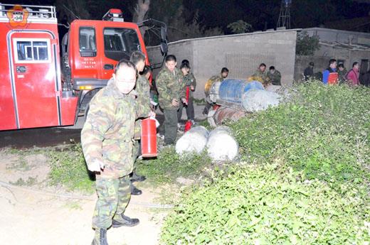 昨日下午傍晚時分,金沙鎮民享村一住宅後方舊式爐灶,因燒開水不慎引發火警,金防部反裝甲連二十餘人第一時間接力以滅火器滅火,金沙消防車組趕到佈水線搶救,軍民合作控制住火勢,所幸未波及鄰近住宅。由於現場濃煙四竄,四名國軍弟兄出現身體不適送醫後已無大礙。陳姓住戶對軍方緊急解危深表感謝。 位於太武山麓的民享村,昨日下午五時三十分許發生一起火警,金沙消防分隊接獲勤指中心通報民宅鍋爐燒起來,由小隊長黃志中,率職消許景甫、柯文才及替代役等共六名動員兩車次趕往現場搶救,義消黃奕泰、黃松齡、張再勝、許怡傑等也趕赴現場協助。 而在消防人員趕到現場前,距火場只有一百公尺的金防部反裝甲連士官兵二十餘人,已第一時間以滅火器及水桶接力救災,所幸初步因應得宜避免火勢蔓延,待消防車趕到場,佈設水線順利控制住火勢,住戶並未受傷。 金防部反裝甲連連長周仲謀、副連長陳中偉、輔導長李國斌、排長涂嘉偉、士官兵正仁傑等表示,昨日下午五時三十分左右,衛哨莊世賢看到濃煙,向安官蔡昌炘回報,隨即由連長周仲謀率隊,動員連上近三十人帶著滅火器及以水桶取水,接力救災初步控制火勢,現場沒有爆炸聲響,而是火勢及濃煙隨風向吹往民享及蔡厝村莊。 消防人員表示,火場周圍佈滿乾燥木麻黃樹及枯枝樹葉,所幸軍方初步處置得宜,以及住戶第一時間將電源插頭拔出,所以火勢並未延燒附近住宅。 現年七十二歲陳姓住戶表示,在房屋後方的爐灶已有一年多沒有使用,因為整理周圍雜亂的木麻黃,故使用枯木起火以爐灶煮水,準備洗澡,未料火勢整個從煙囪竄出,除了把電源插頭拔掉外也趕快報警求救,爐灶毀了,但謝謝阿兵哥第一時間鼎力相助。 民享民眾形容,現場火勢向上衝高,濃煙四竄,還好沒有蔓延影響其他住戶。 而國軍弟兄第一時間緊急於一百公尺遠的營區,來回以滅火器及水桶提水救災,導致有四人晚間因身體不適送醫。 為此,金防部政戰副主任吳福國表示,四位弟兄可能因為跑步及趕著救火,不慎吸入過多的濃煙,晚間出現身體不適,已聯絡家屬並送醫,醫生檢查後表示無大礙,經留院觀察治療後已返回部隊休息。 昨晚,金防部金東守備隊弟兄動員一組人力及消防車現場留守戒護,防範復燃。