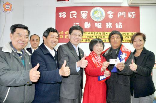 兩岸小三通邁入第10年,來金八年的大陸籍配偶康真女昨日喜悅的從內政部入出國及移民署署長謝立功手中,領取建國100年金門第1張定居證,並立即辦理設籍及申領中華民國國民身分證,康真女興奮表示:「感謝小三通,改變我的人生」。 康真女於昨日下午三時在另一半許忠孝陪同下,前往開設於金寧鄉戶政事務所的移民署金門縣行動服務站,領取定居證。移民署署長謝立功昨日來金了解該站推動「行動下鄉服務」措施的情形,親自將建國百年首張定居證送至康女手上,讓康真女興奮不已。金門縣民政局長翁伸金、金寧鄉長陳成勇、金寧戶政所主任陳世基也在場表達道賀之意。 移民署署長謝立功表示,康真女目前幸福美滿的婚姻,小三通的政策可說是功不可沒,這個時刻同時也欣逢建國百年、兩岸試辦小三通十週年的紀念,康真女領取定居證,意義非凡。他說,這張證不僅代表了它是金門地區建國百年的第一張定居證,也是小三通試辦十週年來,兩岸聯姻成功的最佳例證。 謝立功指出,邁入建國100年,金門的新移民人數預期將突破2000人大關,移民署金門縣服務站結合鄉鎮戶政所開辦的行動下鄉服務措施,主要是提升移民署為民服務的廣度與深度,移民署同仁走出辦公室,主動到金門縣各鄉鎮公所受理民眾的申請案件、送達已辦好的證件、或是提供諮詢服務,做到最即時的便民服務。他強調,未來會持續擴大服務深度和廣度,為散居各地的新移民提供貼心服務。 康真女開心的拿著定居證,在戶政所現場的櫃臺辦理設籍及中華民國身分證,由金門縣政府民政局長翁伸金將中華民國國民身分證送交康真女手上。隨後,康真女也利用移民署「行動下鄉服務」措施,辦理金馬出入境證,在戶政所一次領到定居證、中華民國身分證、金馬出入境證,夫婦倆感受到便民的服務。康真女心中除了感動,更對一路由團聚到定居過程中,所有協助、關懷她的親朋好友,以及移民署署長及所有同仁的幫忙,表達萬分感謝。 移民署署長謝立功還帶來建國百年紀念圍巾的賀禮,祝福她家庭幸福又美滿。 民國90年1月2日實施金門廈門兩地通航(俗稱小三通),從此開啟兩岸互動交往新頁。大陸配偶康真女,也是在這波兩岸互動中,受惠於「小三通」政策,戲劇性地認識了現任配偶許忠孝,成為兩岸聯姻成功的例證。 康真女與許忠孝於民國92年1月,經由許男的姑姑(現居大陸)介紹認識,其姑姑原為台灣人(籍設金門),民國38年前嫁至大陸,後因兩岸分峙,而滯留在大陸廈門無法返台。復因許男父親(籍設金門,已歿)在90年時經由「小三通」前往大陸尋回失散多年的胞妹(即許男姑姑),透過這一層關係,康真女才因此認識了許忠孝。同年4月,在「小三通」推波助瀾下,兩人互許終身,締結良緣,並於9月首次入境金門。 99年12月,因政府對陸政策法規大幅鬆綁,康真女幸運地成為民國100年,在金門地區第一位定居的新移民,同時也是第1位領取身分證之新移民,而民國100年亦同時為兩岸試辦「小三通」滿10週年,一個「小三通」同時串起了一個親情與愛情的故事,也成功地締造了這一家人尋親與聯姻的雙重美談。 康真女8年來,歷經團聚居留、依親居留和長期居留等程序,來往金廈兩地,已經育有1男1女的她,終於如願以償,成為民國100年在金門第1位定居及領取身分證的新移民,為試辦屆滿10週年的小三通掀開新頁。 康真女領到定居證,而且獲贈建國百年紀念圍巾的賀禮,當場興奮地說「太高興了」、「感謝小三通,改變我的人生」。 在餐廳打工貼補家用的康真女表示,拿到定居證和身分證,就可享有金門縣民的福利,例如搭乘公共車船免費或搭船小三通回娘家享有折扣等,希望未來找到更穩定的工作。 除了康真女,另一名從福建泉州市嫁到金門縣金寧鄉古寧村的吳雪琴,領取移民署今年核發的第2張金門定居證,並向金寧鄉戶政所辦理設籍和申領國民身分證。吳雪琴內心也充滿了喜悅。吳雪琴希望有了國民身分證,可以找到更好的工作。