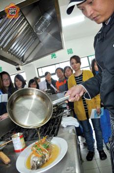 「年菜料理」不僅要色、香、味,還要加上器、形;也就是要色、香、味、器、形俱全! 金門農工昨天辦理「年菜料理」廚藝示範教學,邀請稻江科技暨管理學院餐旅管理學系中餐教師呂哲維擔任講師,呂哲維是去年客家筵席料理比賽職業組的冠軍(獎金三十萬元)。 他把色、香、味、器、形俱全的觀念傳授給金門農工的學生及參加研習的社會人士。色是指菜色的顏色搭配;香是指調料和菜的香味;味是指味道鮮美;形是指形態美觀;器是指器皿與菜的搭配協調。 昨天的教學呂哲維把客家筵席料理比賽冠軍的菜單拿來當做教學材料,號稱價值三十萬元的菜單。 呂哲維在「年菜料理」中示範的菜色包括「巧智慧心慶團圓」(冷盤)、樹子荔梨燉金雞(湯品)和酸菜蔭脯網鱸魚(熱菜)。他表示,他教的主要是技巧,材料可以取代。 其中,酸菜蔭脯網鱸魚的材料包括:鱸魚450g、絞肉50g、豆豉25g、碎蘿蔔乾25g、辣椒碎30g、薑末15g、紅蔥頭15g、蒜碎15g、豬網油80g、酸菜絲30g、辣椒絲30g、青江菜50g、紅蘿蔔條10g、辣椒蔥絲10g。所需調味料包括:蔭油35g、蔥油25g、糖15g、雞高湯250g。作法如下: 一、將酸菜泡水、洗淨後切細絲;碎蘿蔔乾泡水洗淨。 二、起鍋爆香蒜碎後加入酸菜;福菜絲及辣椒絲煸炒後加入高湯煮至收乾;湯汁調味起鍋,淋上少許蔥油備用。 三、另起鍋爆香蒜碎及紅蔥頭、薑末;加入餃肉炒香,再加入碎蘿蔔乾煸炒;加入豆豉、少許蔭油及雞高湯略煮。起鍋加入蔥油拌勻。 四、將洗淨的黃金鱒魚去除魚骨後,再將炒好的酸菜絲包入魚肚中,接著再淋上炒好的蘿蔔乾肉末,然後以網油包起;用大火蒸二十分鐘,再擺上燙熟的青江菜即可。 巧智慧心慶團圓是由五道菜組成的冷盤,包括「苦盡甘來」、「紫蘇梅溪哥魚」、「板條杏仁柿香捲」、「涼拌杏鮑菇絲」、「蛋醋蘆筍」。 樹子荔梨燉金雞的材料包括:卓蘭高接梨350g、彰化荔枝乾50g、台灣黃金雞450g、山藥250g、樹子50g、薑片35g。所需的調味料包括:雞高湯1000g、鹽25g、香菇精35g。作法如下: 一、將高接梨、山藥切塊。二、將黃金雞切塊,汆燙備用。三、將高接梨塊、山藥塊、荔枝乾、黃金雞塊、樹子、薑片與高湯盛裝於湯盅內。四、放入蒸籠內蒸二個小時,取出後,以鹽、香菇精調味即可。 國立金門農工職業學校是為執行「均質化」計畫而辦理這項「年菜料理」廚藝示範教學,金門農工校長希望藉此提升金門的觀光餐飲文化。