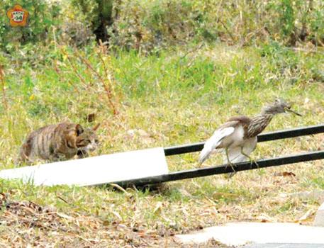 貓盯池鷺,求「葷」成空!在金湖重劃區的草坪,有一隻野貓蓄勢待發,窺視著一隻池鷺。不過,不知是什麼原因,野貓突然改變了心意,放棄望空偷腥,掉頭離去。 出現在金湖重劃區的池鷺,俗稱沼鷺。牠在一個傾倒的廣告架上緩緩移動。當時,野貓對牠虎視眈眈,池鷺不知是沒有把貓的伏候當成一回事,還是根本沒有警覺。不過,雙方靜止了一段時間之後,野貓突然轉身離去,不知是對自己沒有把握,還是看到附近有人類靠近-有「螳螂捕蟬,黃雀在後」的顧慮,以致「貓肚子裡放虎膽」卻凶不起來;又或是「貓嘴鴨子爪」-嘴饞卻不能幹。 貓走了,人來了,沼鷺還是「老神在在」,並沒有被嚇走;鳥頭上的「怒髮衝冠」,不知是否與牠的心防有關。 根據相關文獻的記載及報導,池鷺的虹膜為金黃色;鳥喙是黃色,尖端黑色;腳黃色。全身大致為土黃色,胸前有白色縱紋。牠的食物可以是小魚、蝦蟹、蜻蜓、毛蟲等。 池鷺的肉被中醫認為有解毒的功能,因此曾經成為被人捕殺的對象,加上環境污染和環境條件惡化,在某些地方的種群數量已明顯減少。 在金門地區,池鷺是普遍冬候鳥,曾出沒於太湖、榮湖、浯江溪口、慈湖、雙鯉湖、陵水湖等地。在台灣,牠是稀有的冬候鳥。在台灣地區,池鷺的出現,表示溼地所在地的生態環境良好。 有人說池鷺的警戒性很強,靜止時像「打坐參禪」,但隨時都在提高警覺。不過,在重劃區被貓盯上的這隻池鷺,能忍受天敵接近到一撲即至的距離,禪定的功夫未免太高了! 貓是面圓齒銳、行動敏捷的哺乳綱食肉目動物。在人類心目中,貓捉老鼠好像是天經地義的事情;不過,貓還是會覬覦其它的動物。牠和其它大型貓科動物相似,面對獵物會先埋伏,再迅速捕食。 華人有許多成語或歇後語是以貓當題材,例如用「貓噬鸚鵡」比喻排擠善類;用「貓哭老鼠」比喻假慈悲;用「貓吃生柿子」諷刺「色迷迷」(澀與色同音;貓叫聲為咪咪,音近迷迷);用「貓見了魚」表示真想求婚(葷)。