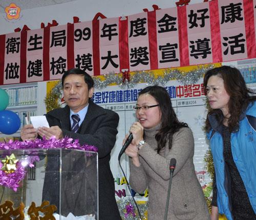 金門縣衛生局昨舉辦「99年度金好康免費健康檢查│做健檢摸大獎」活動;抽出電冰箱、液晶電視等三百五十個獎項。 領獎期限為自即日起至民國一百年一月七日止,逾時將取消受領資格。領獎時必須攜帶個人身分證、印章及摸彩券存根。諮詢專線為:330697轉802(黃先生)。 活動中由衛生局局長陳天順、副局長李金治等分別抽出三百五十項獎品及幸運兒。陳天順表示,打造健康是一種慈悲施政,希望衛生局同仁持續努力,創新點子,讓民眾願意走出來接受健檢。 「99年度金好康免費健康檢查│做健檢摸大獎」的中獎人及抽中獎品如下: 電冰箱一台│吳清城。32吋液晶電視一台│何紀平。 腳踏車五台│黃如玉、張長成、蔡能燕、蔣華莉、李吳彩秀。 音響組合五台│洪秀玲、辛明麗、郭彩雪、楊福建、蔡秀認。 影音光碟機三十五台-黃碧玉、蔡志堂、歐陽良彬、何應松、黃金鐘、李漢強、蔡明霞、林國佐、倪嫦娥、薛含錦、盧俊傑、蔡賢寬、鄭玉鳳、何麗珠、葉俐、陳詩從、陳崑福、蔡胡治、許雪招、許新民、陳銀治、林淑語、葉清花,陳美女、李翁金葉、楊忠群、陳秀香、王建裕、林碧芳、陳添丁、呂盈慧、楊西、陳蒼龍、楊蕉、陳敏慧。 禮券一百份│陳麗紅、吳玉園、蔡顯森、莊燕霜、許永澤、羅進治、王仲強、蔡翌紅、何克西、許莊明華、黃鼎足、洪存德、許秀娥、鄭易明、許陳能治、董秀蘭、黃菊芳、吳黎治、黃靜柯、張玲娜、李玉昭、黃文遠、張水玲、繆宇、李增踐、蔡月秋、吳文川、許松塔、林洪美治、楊庭訓、蔡金水、馬嘉吟、洪麗治、洪秀猜、蔡天錫、林玉英、陳美黎、翁麗輝、洪清漳、周招治、洪秀卿、葉長茂、洪曉、李雪裡、許榮文、陳雅玲、洪碧玉、翁雅萍、陳志忠、黃進財、李友、王慧騏、李淑玉、翁承理、許碧蓮、黃曉裡、劉進羨、楊肅進、許玲琦、王能月、陳桂清、李慧菱、姚美霞、黃金朝、吳耀地、蔡天晉、蔡督芳、蔡圭、林仲鶴、洪勸治、柯秀瓊、許績猛、林長文、張婉儀、薛秀枝、張長木、王素卿、蘇建芳、莊瓊華、林紅緩、謝素慈、劉葦志、呂淇女、謝麗琴、方碧螢、陳振全、黃幸甚、黃志華、許財贊、王精敏、林炳東、陳素雲、許乃天、李敬山、林罔固、李雅晴、陳查某、李經欣、張麗英、郭昭伶。 宣導品二百零四份│陳延榮、洪玉治、李亞蒂、林愛羨、陳麗華、何明枝、黃尚自、許凱凌、方雪蘭、陳來富、黃春源、呂素芳、李蔡秀娥、林明富、黃邦道、張鶴、許秀惠、黃凱蘭、許績偉、黃榮舉、許乘輝、吳美蕙、楊漢中、黃愛治、呂麗蓉、董建森、李瑞昌、陳世保、蔡琪泰、顏克亞、李能瓊、翁麗寶、李佳蓉、黃德殿、李欽賜、張金城、許秀保、張育群、黃志遠、方水甲、李董素衣、蔡承利、陳維成、陳寶愛、王崇帆、楊朝木、薛金梨、王榮譽、洪秀芳、莊劉金葉、蔡承群、林羅謀治、方刊治、郭秀琴、陳泓序、唐敏雄、陳玲琴、林德齊、陳愛珠、陳賜發、翁偉忠、陳高興、周艷治、陳玉珠、陳掽、吳彩惠、洪金環、鄭玉鳳、揚依依、李金羨、林清河、劉水城、張聰進、蔡開河、楊平和、顏國慶、吳玉寶、李研治、李玉榮、陳淑珍、王碧梨、周宏興、陳建明、陳永沛、徐彩鳳、陳秀華、邱建中、黃媽養、莊森祥、翁福林、林丁滾、吳媽相、黃彩蓮、林金治、黃建南、呂寶珍、楊文耽、陳美真、王任桂、唐得竣、楊淑昭、楊子夜、林洪迎、田玉枝、林惠靜、許秀明、葉良安、洪烏宙、鄭碧霞、何抱治、林麗娟、吳玉配、王淑慧、李增件、陳水沛、許福蔭、鐘洪菊、陳允南、董志達、吳美娟、葉彩真、吳永城、葉維明、吳郁析、李仲和、林長裕、許玉燕、許阿娟、李蔡玉珠、周千錢、吳東展、陳言螺、莊水鈴、黃雄飛、洪海瑚、楊炳妹、陳建治、劉登英、城勇生、吳思遠、李許淑卿、張絹絹、王麗芬、林能慧、張少欽、楊金治、李文勇、陳秀全、陳蔡翠暖、吳明惠、翁曉萱、鄭玉玲、許丕山、何再明、黃駿昌、李標治、黃張秀鑾、楊燕泥、洪忠頤、周金順、何泉平、黃鳳英、林泡、莊嘉哲、蔡淑娥、羅洪玉、楊素治、楊肅淾、黃則烟、周昭治、張則敬、李查某、翁俊文、林明薇、陳慶虎、許雪華、許乃和、王明宗、王峰嫻、鄭員、莊玉燕、鄭金權、張鴻亮、鄭彩芬、陳惠敏、張金溫、邱智芬、許景目、陳闊、王金謨、沈春梅、陳忠輝、陳德忠、呂光華、張麗瑞、黃水安、黃維堅、黃永生、黃寶鳳、許琇玲、李錫敬、林鉗、何愛智、許明雪。