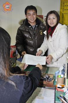 建國一百年元旦舉國歡騰,新人忙著預約元旦登記結婚。昨日迎娶美嬌娘的楊政儒說,百年元旦值得慶祝,故以此日作為兩人結婚最有意義的紀念。鄭榮璋、蔡怡萱則預約一百年一月一日十一時登記結婚,兩人要用特別的日子加上良辰吉時,為結婚留下最美好的記憶。 建國一百年元旦,除了到處有慶祝活動外,結束愛情長跑步入禮堂的新人們,依地方特有禮俗舉辦迎娶儀式後,紛紛選擇以建國百年這天為兩人的愛情作最完美的註解。 根據金沙戶政事務所表示,國人結婚改登記制後,平常上班時間均可以到男、女其中一方之戶籍所在地辦理結婚登記。若遇假日則是要提前三天預約,因為建國百年元旦日子特殊,又剛好在星期六,故想要以建國一百年元旦作為結婚登記日者,必須在昨日(二十九日),三天前提出預約申請。 金沙戶政事務所共計有一對新人提出預約元旦登記申請,另有一對佳偶於上午現場辦理預約元旦結婚登記。金湖戶政事務所昨日下午也湧入兩對新人現場登記百年元旦結婚,另外有一對新人鄭榮璋、蔡怡萱則預約一百年一月一日十一時辦理登記。 金沙戶政事務所表示,提預約登記按規定遇例假日需三天前提前預約。昨日除可以在現場辦理預約百年元旦登記結婚;也可以提出預約書於元旦當日再前往登記結婚。其差別在於,預約百年元旦當天辦登記者,換證日期也為建國百年元月一日;而現場辦理預約百年元旦登記者,換證日期則為當日日期也就是二十九日。 楊政儒昨日迎娶美嬌娘張珊珊,兩人於下午到戶政事務所現場辦理完成百年元旦結婚登記。他說,百年元旦值得慶祝,就像兩人的愛情一樣,不只好記也為彼此的愛情作最佳見證。 另外,鄭榮璋、蔡怡萱則於昨日下午到戶政事務所提出預約申請書,選擇在民國一百年一月一日十一時前往登記。兩人說,千載難逢的日子,別具意義加上良辰吉時,就像兩人結髮一輩子一樣美好,故選擇以此為彼此留下最完美的記憶。
