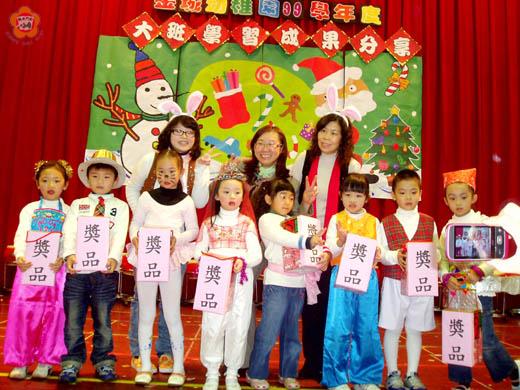 金城幼稚園廿九日舉辦九十九學年大班小朋友學習成果分享發表會,各班小朋友輪番上場精彩演出,展現平日努力及老師們辛勤教學的成果。園長盧淑惠頒獎表揚績優班級,期盼透過表演與觀摩互動,讓孩子學習審美欣賞與做為一個觀賞的人應有的態度與禮儀。 金城幼稚園舉辦大班小朋友學習成果分享發表活動,安排小朋友透過歌劇、舞蹈、律動表演秀出平日努力的成果,園長盧淑惠及各班家長、師生全程參與這項寓教於樂的活動,各班小朋友精彩演出,博得家長報以熱烈掌聲喝采,肯定學校的教學,讓孩子們能快樂的學習,健康的成長。 昨日大班小朋友演出的曲目有娃娃的故事、郵遞馬車、四季謠、野蠻遊戲、來跳舞、打掃妞妞妞、撐腰、新年好運到、旗開得勝等多首精彩曲目。