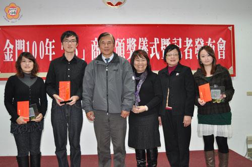 金門縣政府舉辦的「金門百年心商品」創意紀念品競賽,經過初選、決選優勝成績出爐,賴冠傑設計的「金門四寶」紀念隨身碟奪得特優獎,縣府主任秘書盧志輝頒發獎座及獎金表揚,得獎作品將於民國100年擇優開發為專屬金門的建國百年紀念品。 為參與中華民國建國百年紀念活動,彰顯金門在建國百年歷史中扮演的角色及地位,金門縣政府特以「金門百年『心』商品」為題,舉辦創意紀念商品設計甄選活動。設計主題定位為,表現「金門百年」的和平意念及歷史意義、打造金門新(心)形象,展現在地特色,作品需具文化藝術性及議題擴充性。 「金門百年心商品」創意紀念品競賽頒獎典禮及發布會,於昨日下午在縣政府大禮堂舉行,縣府建設局長葉媚媚等人到場觀禮,賴冠傑由縣府主任秘書盧志輝手中接下特優獎座及獎金新台幣五萬元。 這項「金門百年心商品」創意紀念品競賽,在20件參賽作品中,就讀明志科技大學視覺傳達設計研究所的賴冠傑,參賽作品為「金門四寶│百年『記』念」,拿下特優獎。 賴冠傑的作品,以「記」念為作品名,強調隨身碟可以記錄的特性,造型是以金門風獅爺、八二三砲彈、菜刀、高粱酒做為隨身碟設計題材,具有在地特色,並兼具美觀性、實用性,獲得評審的青睞,成為金門官方指定的建國百年紀念品。 入選獎有4名,分別是陳韋彤的「玻璃九紋龍筆」、張依仁的「迷彩子母旅行背包」、陳季臻的「風獅爺俄羅斯娃娃」,以及黃嘉玲的「存錢筒胸章組」,各獲頒獎座和獎金2萬元,得獎作品縣府將擇優開發為專屬金門的建國百年紀念品。