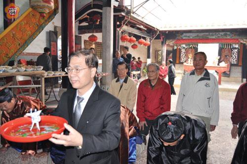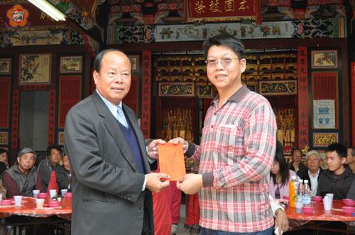 烈嶼鄉埔黃洪氏家廟昨在冬至日,舉行隆重祭祖和博士洪志生晉匾儀式;在中午「吃頭」,男女均可參加,開兩性平等之風氣。埔黃洪氏家廟主任委員洪成發也頒發獎助學金,期勉得獎學生以傑出鄉賢為學習的模範,努力向學,走出學校之後為國家社會和家鄉服務。 埔黃洪氏裔孫洪志生博士,現年五十六歲,黃厝人,陸軍官校正51期,一九九八年政戰學校政治研究所博士,擔任陸軍專科學校兼任助理教授。洪志生在學有所成,感於先祖庇佑,於昨(冬至)日上午八時,晉「博士」匾予埔黃洪氏家廟,敬獻爐敬金新台幣十萬元,作為宗祠活動之經費,族人到場觀禮,且與有榮焉。 埔黃洪氏家廟冬至祭祖儀式於昨天上午十一時隆重舉行,長老洪清水主祭,烈嶼鄉長洪成發和博士洪志生及族人陪與祭;在上香和獻禮後,在主祭官洪清水率領行跪拜禮。之後,也祭拜文昌帝君和福德正神,祈求冑裔盛昌,永有麻光,洋溢著慎終追遠和過節的氣氛。 祭祖之後,埔黃洪氏族人並在家廟「吃頭」,男女均可參加,開兩性平等之風氣。該廟主委洪成發也頒發獎助學金,由在場家長代領,博士一人、碩士一人、大(專)學四人、高中職二人、國中九人、國小十五人,各得一萬元至五百元不等獎金。 洪成發表示,得到獎助學金是一種鼓勵,希望以傑出鄉賢為學習模範,努力向學,走出學校之後為國家社會和家鄉服務。同時,他並感謝鄉親的支持當選鄉長,有為全體鄉民服務的機會,除全力爭取鄉民就業機會之外,希望鄉親對於鄉政有何建議,隨時均可提出或向鄉公所來反映,共同促進鄉政建設的進步。