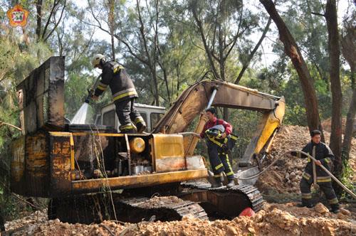 一部大怪手昨天在料羅圓環附近整地時,突然起火;怪手駕駛趕緊請工地的同伴用小怪手挖土滅火。 昨天上午九時五十分左右,位在環島東路五段和三多路交會處的一處工地,有一部怪手因為柴油漏油,導致火燒車。 金湖消防分隊、金沙消防分隊出動了五部車輛,十多名職消及替代役男馳救。由於大怪手司機在第一時間曾請小怪手司機用覆土的方式滅火,消防人員到場之後,用一條水線就控制了火勢。 據怪手司機表示,他在施工時,發現柴油外漏,打開引擎蓋檢查,結果突然發起大火。當時,他正在為養工所的工程進行整地。 他的怪手車齡已十多年,幾年前他以六十萬元買下這部二手車,不久前才花費十幾萬元做過大修,沒想到竟然會漏油;他懷疑是油管用得不適當,懊惱當初沒有要求修車廠用好一點的管路。 昨天參與滅火的消防人員包括:金湖消防分隊小隊長陳梓和、陳平、洪國慶、金沙分隊分隊長陳叄奇等;第二大隊大隊長林俊也於火勢控制後,到場調查起火的原因並拍照存證。