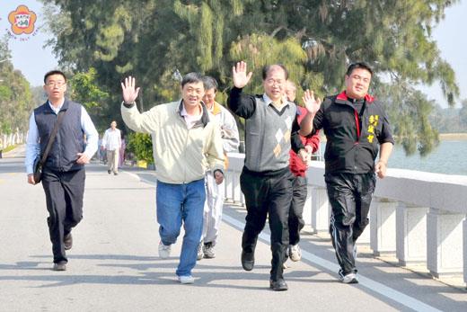 議會定期會第四質詢小組昨日對縣府團隊進行體能大考驗,邀集縣府一級單位主管、二級機關主官,及縣警局課長級以上、金酒公司組長級以上人員環繞太湖跑三千公尺,結果八成以上均能在廿分鐘內完成,展現縣府團隊主管的活力。議員建議縣長將跑步的成績列入年底考績,廿分鐘內跑完全程者考甲等、廿分至廿五分考乙等,廿五分以上考丙等。 縣議會定期會昨日縣政總質詢議程輪由第四質詢小組上場質詢,小組成員議員蔡春生、李誠智、洪麗萍、李成義、楊永立、謝東龍,特別利用第二節質詢時間(上午十時四十分至十一時三十分)邀請縣府團隊跑太湖進行體能大考驗,縣長李沃士親自率領縣府及附屬單位主官管,及金酒公司的組長以上、縣警局課長級以上的主管到場接受考驗,議員蔡春生、李誠智、歐陽儀雄也陪同大家跑完全程。而議員楊永立、洪麗萍、謝東龍、蔡水游則是在終點負責計時計分。大批人馬的到訪,讓平日寂靜的中正公園頓時熱鬧起來。 在環繞太湖近三千公尺的路程中,縣警局保防室主任李沃實以十二分二十三秒率先抵達終點,年輕的金酒公司秘書李俊彥十二分二十七秒居次,縣警局勤指中心主任蔡秋風以十二分三十二秒跑第三名。 而縣長李沃士也以十七分四秒的佳績跑完全程,在公務繁忙之際,展現絕佳的體力與治理縣政的活力,也受到大家的讚賞與肯定。現場除了有溫茶、熱茶、海淡水讓大家解渴外,畜試所也貼心準備了金門牛奶讓大家補充體力。消防局也出動一部救護車在旁待命,不過,卻是無用武之地。