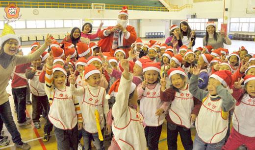 聖誕鈴響,佳節腳步近,金沙國小幼稚園昨配合學習主題,七十六位學生一起渡過別開生面的派對,小朋友集結於活動中心,完成耶誕樹佈置,手舞足蹈,互道祝福,校長王添泉化身聖誕老人與學生共舞並發禮物,小朋友陷入瘋狂,童言童語增添笑料,讓活動充滿歡笑,人人滿載而歸。 哇!原來校長是聖誕老人。金沙國小幼稚園昨日辦理聖誕派對,七十六位學生在老師的帶領下,在活動中心透過舞蹈、團體活動營造熱鬧的佳節氣氛,現場HIGH翻天。