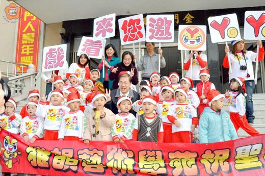 聖誕節的腳步愈來愈近了,私立雅韻藝術學苑幼兒園幼生,昨日在園長梁明玲和老師陪同,熱鬧前往金門縣政府進行聖誕報佳音,純真又活潑的小朋友們受到縣長李沃士熱烈歡迎,並致送每位小朋友一份聖誕節禮物,全都「滿載而歸」,現場歡笑聲此起彼落,瀰漫著濃濃的聖誕節氣氛。 由雅韻藝術學苑五十位小朋友,頭戴紅色聖誕帽,在園長梁明玲和老師帶領致送每位小朋友一份聖誕節禮物,昨日上午九時抵達縣政府時,縣長李沃士、社會局課長許美鳳等也在場歡迎,李縣長也致送每位小朋友一份聖誕節禮物,而天真活潑的小朋友,也以聖誕快樂、平安夜、祝新年快樂歌聲,祝福終日為縣政忙碌的「縣長伯伯」聖誕節快樂,同時邀請李縣長欣賞該學苑於文化局舉辦的聖誕節音樂嘉年華慶祝活動。 雅韻藝術學苑小朋友在園長梁明玲和老師帶領,至縣府大樓內各單位「報佳音」,小朋友們以手搖鈴伴奏大聲唱出聖誕歌曲,精彩的演出獲得了熱烈的掌聲。 在聖誕節來臨前,雅韻藝術學苑幼兒園幼生除了舉辦「報佳音」活動之外,並於12月25日下午二時在文化局演藝廳舉辦「聖誕節音樂嘉年華會」,屆時也歡迎各界人士共襄盛舉,一起歡度聖誕節。