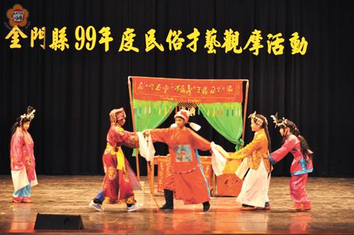 一年一度的地區各級學校民俗才藝觀摩活動,昨日在金門縣文化局演藝廳登場,計有高中職、國中、國小組二十六支隊伍共聚一堂,以精采的演出進行民俗才藝觀摩。縣長李沃士也以各校走出自己不同風格民俗才藝,並期融入社區參與,並透過不斷的努力,更上一層樓,來活潑、豐富金門的藝文提升。 觀摩活動昨日上午九時三十分起,由中學組的金湖國中以二十四節令鼓「驚蟄」表演開始,接續金寧中小學國中部演出民俗舞蹈「大花轎」、金城國中推出民俗才藝「趕擺會上、三個p」、金門高中推出國樂演奏(室內絲竹樂)、金沙國中演出民俗才藝「鼓舞兆豐年」、金門農工職校演出民俗舞蹈「幸福獵人」、烈嶼國中表演民俗才藝「祥獅獻瑞」,均精采呈現平日訓練成果。各隊觀摩後,並由縣府教育局主任督學陳金文頒發獎金鼓勵。 昨日下午一時三十分起,再由國小組十九支隊伍進行民俗才藝觀摩演出。 國小組係由開瑄國小率先演出二十四節令鼓│雷霆萬軍,接續古城國小演出民俗舞蹈│千尺浪、中正國小演出民俗才藝鑼鼓齊鳴慶佳緣、金寧中小學國小部表演民俗舞蹈沖繩祭典之旅、賢庵國小表演民俗舞蹈春風搖曳慶佳年、述美國小演出跳鼓陣、多年國小表演民俗舞蹈甜蜜夜上海、何浦國小表演民俗舞蹈│戰、湖埔國小推出民俗才藝歌仔戲「春江畔」、上岐國小表演民俗舞蹈紫竹新調、安瀾國小推出民俗舞蹈遊龍戲鳳、金鼎國小表演民俗體育│飛樂鈴颺、古寧國小表演民俗舞蹈│天空、草原情、正義國小推出民俗體育鑼鼓慶豐收、西口國小演出民俗舞蹈│雲中月水中情、金湖國小表演民俗舞蹈│桔梗謠、柏村國小推出民俗舞蹈│開門紅、金沙國小演出舞之饗宴、卓環國小推出民俗舞蹈│歡樂的跳吧。 縣長李沃士昨日也在緊湊行程中,於下午三時三十五分抵達文化局演藝廳,觀賞了兩個表演節目,他在頒發獎金予國小組各校代表時,也感受金門這幾年來,在學校校長、教師辛勤帶領下,舉凡鑼鼓、節令鼓、民族風情演出、歌仔戲等,都走出學校自己在民俗才藝不同風格,特別表達肯定和感謝之意。並對國小學生年紀雖小,但上場均有很好表現,實屬不容易,並期學校民俗才藝融入社區參與,且透過不斷的努力,來更上一層樓,以活潑、豐富金門的藝文提升。 這項民俗才藝觀摩,教育局長李再杭、課長許能麗及各校校長、指導老師,也都踴躍到場為各隊或自己學校加油、打氣,場面相當熱絡。縣長李沃士也開心的和國小組各隊合影留念。