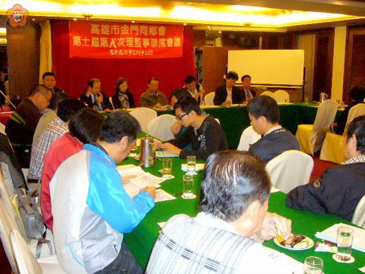 高雄市金門同鄉會昨(12)日下午四時假高雄市福華大飯店金龍廳召開第十一屆第八次理監事聯席會議,宣讀本年度7月至11月會務工作、財務收支狀況暨監察報告,審核10月份財務收支,並討論通過二月份將邀同鄉一覽台北花博。 該項會議由理事長翁明祺主持,縣府南區服務處主任蔡忠盼、高雄市政府經濟發展局縣籍科長呂德育等貴賓與會指導。與會理監事在會中發言踴躍,會場氣氛融洽。 提案討論方面,財務收支報表經大會審查後無異議鼓掌通過,有關第九次理監事聯席會議開會時間、地點,考量年關將屆,決議按原計畫於100年1月中旬前召開;年度旅遊案部分,會中討論通過暫定年後2月19、20日舉辦台北花博兩天一夜遊。會議在與會理監事暢所欲言和討論提案後圓滿閉幕。