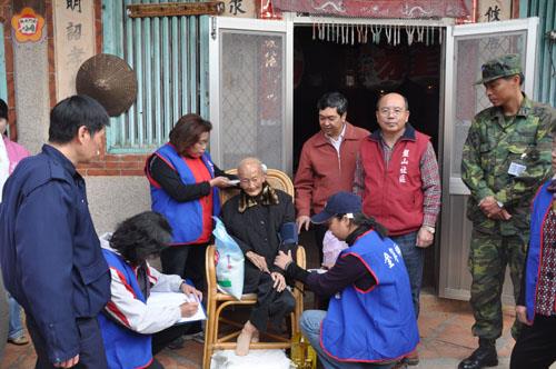 金寧鄉長陳成勇帶領盤山社區照顧關懷據點志工利用假日服務獨居老人,送慰問品,也做健康服務。縣警察局金寧分駐所、金西守備隊也一起送來溫暖的關懷,讓受慰者滿心的感謝。 陳成勇帶領盤山村長翁水河、社區發展協會理事長翁炳炎、志工隊長翁玉華、金寧分駐所長許耀華、金西守備隊處長王士誠和志工們,帶著麥片、白米、沙拉油等慰問品,探慰社區內的獨居老人,志工們也帶著簡易的健康器材,為老人家量血壓,了解身體狀況。 陳成勇很肯定該據點志工義務性的付出,尤其是關懷獨居老人區塊,做的很落實,提供送餐服務、居家環境整理、緊急醫療聯絡,以及日常的探訪關懷、健康服務,發揮了據點的服務功能,為其它社區樹立學習的榜樣。 陳成勇感謝金寧分駐所、金西守備隊也一起來關懷弱勢鄉親,他說,雪中送炭要比錦上添花要有意義性,也會讓弱勢鄉親感受到社會的溫暖。 陳成勇說,社區好比是一個大家庭,讓有能力作志工的人,可以發揮自助、人助的精神,不管是電訪、居家整理、慰問或是送餐服務,使社會更加溫暖和溫馨。