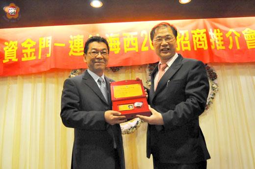 『投資金門-連結海西』招商推介會昨續在金門舉行,計邀請廈門企業、台商企業等約一百人到金門考察,晚間縣長李沃士也特別設宴歡迎他們,希望大陸各地的企業家及台商都可以踴躍來金門投資,推動金門的經濟發展;此外,昨日會中也頒發「金門縣榮譽縣民證」給廈門市台商投資企業協會會長曾欽照,感謝他對金廈兩地交流、人員往返等措施,協助向中央與縣府提供殷實建議。 繼12日在廈門盛大舉辦『投資金門-連結海西』招商推介會的活動,金門工商投資策進會昨也邀請超過百位的廈門各企業與台商企業,實際到金門來走走看看,一整天下來,陸續考察了溪邊海水浴場、水頭商港、林務所與莒光樓等週邊土地,大家都對金門的優美環境,讚譽有加。 晚間六時三十分,縣長李沃士也特別設宴歡迎他們,與會人員包括有:前議長謝宜璋、議員謝東龍、縣府參議張忠民、財政局長黃景舜、社會局長方天吉、衛生局長陳天順、民政局長翁伸金、金門工策會總幹事蕭永平、人事室專員錢忠直、廈門國貿集團公司駐台辦事處主任葉志成、福建交通運輸集團有限公司駐台辦事處主任鄭亞寶、廈門台商協會會長曾欽照、副會長高銘樹、廈門華天港澳台商品購物有限公司總裁吳友華等人。 李沃士表示,歡迎大家可以到金門來走走看看,希望在考察之餘,可以發現投資金門的好機會,踴躍來金門投資,讓兩門的合作領域,透過兩岸雙向投資,都能互利互惠,共同合作,建設繁榮金門。 曾欽照也提到,金門是離廈門最近的樂土,相信在李縣長積極而有魄力的領導,未來的金門發展絕對會一天比一天還好。 昨日會中,李沃士也頒發「金門縣榮譽縣民證」給即將卸任廈門台商會長的曾欽照,縣府交通旅遊局表示,曾會長在任廈門市台商企業協會會長的兩屆四年期間,對金廈二地交流、人員往返等措施,提供殷實建議;並以台商身分積極建議中央政府重視金門地區的經濟發展,提供發展建言,促使中央政府重視金門,迨有現今兩岸關係和諧、人員往來頻仍;又以取之社會回饋社會精神,曾多次以廈門市台商協會名義在金門(烈嶼)施放兩岸煙火等,總贊助金額近百萬元,為地區觀光增色不少,舉凡積極參與推動社會公益、協助推動城市外交,又能對縣政興革推出具體建議,該優良事蹟殊值表揚。