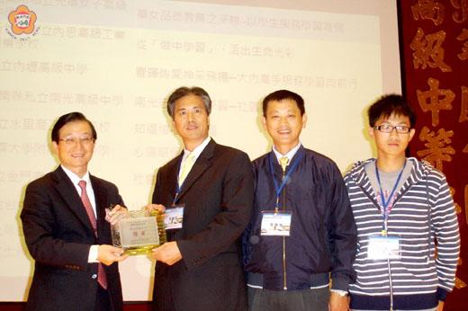 99年度全國高級中等學校服務學習創意競賽評比,金門高中經過評審嚴格篩選,歷經初審及複審層層關卡,獲得全國高級中等學校服務學習創意競賽優等獎,金門高中校長蔡錦杉率員赴台由教育部長吳清基手中領回這項殊榮,也將金門地區高中職校服務學習新趨勢,推向另一個新的里程碑。 金門高中指出,98年度起教育部主辦全國高級中等學校服務學習創意競賽,迄今邁入第二年啟動計畫,金門高中以「進來學習、出去服務」&「活力扶少、深耕金門」&「打造社區、連結世界」的主題方案,歷經初審及複審層層關卡,在評審嚴格篩選下,最後被評定為全國高中職校優等獎,可謂實至名歸。 日前在臺北市政大附中演藝廳舉行「九十九年度全國高級中等學校服務學習創意競賽暨觀摩會」,由教育部吳清基部長親自主持,金門高中校長蔡錦杉率同扶少團指導老師張序伯、扶少團團長黃彥瑋一同前往領取得來不易的「優等獎」,也為金門地區高中職校服務學習新趨勢,推向另一個新的里程碑。 金門高中校長蔡錦杉及學務主任李立邦及訓育組長黃主真,特別感謝指導老師張序伯平日為這個社團投入許多時間、精力、金錢及結合金門扶輪社資源,讓金門高中扶少團夥伴們願意付出行動,積極參與大陸及臺灣及金門地區各項服務活動,屢次獲得肯定與讚賞。蔡錦杉也肯定夥伴們在課餘時間或假日,積極結合該團每學期定期前往金門家扶中心參與國小學童課業輔導活動及大同之家安老院照顧老人等各項社會服務工作,夥伴們展現的活力熱情充滿感恩與滿滿的愛心,也為該團注入一股新活力,更是學校最有特色績優社團之一。