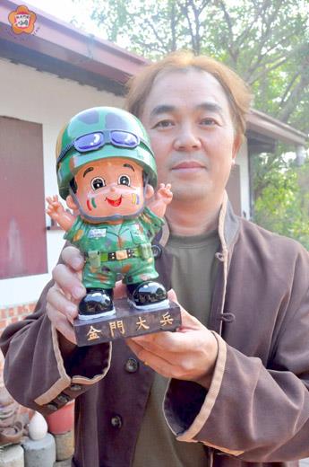 繼神明公仔、城小寶寶公仔後,浯州陶藝創意總監王明宗最近又把腦筋動到軍人身上,製作「金門大兵公仔」,這組Q版公仔的裝扮,把軍人的標準配備全穿戴上身,還可以黏上番號。王明宗說,未來主力希望能搶攻阿兵哥市場,讓來金門當兵的人,都可以買到最不一樣的紀念品,珍藏這段難忘的留金歲月。 「大兵日記」、「新兵日記」等電視劇再度帶動國內軍教片熱潮,看準這股風潮,王明宗花了大半年時間草稿設計,終於製作出超「卡哇伊」的「金門大兵」公仔,讓看過的人,都相當喜愛。 王明宗說,「金門大兵」公仔,約25公分高,目前只有陸軍軍種,乍看之下,可愛的臉龐,有點神似總統馬英九,公仔身穿迷彩服、頭戴鋼盔、腳穿大頭皮鞋、身上還有配槍,且兩手都比出YA,完全就是現今大頭兵的可愛版。 王明宗表示,這款公仔雖然才上市月餘,但頗受歡迎,許多阿兵哥還透過部隊團購,作為退伍紀念,目前已銷售約1000多尊,訂價約500元,但軍方批發價僅需360元,折扣「殺」很大,也是產品熱銷的原因之一。 除了陸軍外,王明宗也指出,未來包括空軍、海軍甚至解放軍等各項軍種,都可能是大兵公仔的下一波商品,他也直言,公仔的市場潛力無窮,希望可愛的公仔,未來可以跟金門風獅爺一樣,行銷兩岸三地。 有別於陶瓷的脆弱、保存不易,王明宗說,大兵公仔是使用冷瓷(俗稱為:波麗POLY)來製作,所以材質相當輕巧,且不易碎裂,很適合年輕人收藏,可望成為地區新的文化創意商品。 王明宗強調,現在應該多設計有金門特色、真正屬於金門的東西,讓觀光客來金門想購物,而公仔基本上沒有退流行的問題,也有很長的產品週性,若好好來做,可是大有可為,行情看俏。