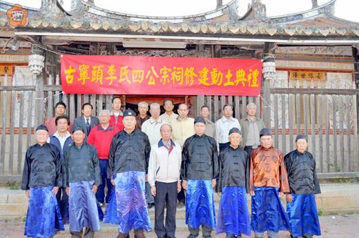 古寧頭李氏四公宗祠年久失修、椽傾樑腐,族中長老倡議重建,成立修建籌備委員會研議,並於農曆十月廿九日辰時由籌備主委李再杭主持修建動土典禮,目前正展開籌建各項工作事宜,待明年方進行宗祠動工興建期程。 古寧頭李氏四公宗祠修建動土典禮於日昨(農曆十月廿九日辰時)舉行,由古寧頭李氏四公宗祠修建籌備委員會主任委員李再杭帶領三奇、主房、進房、合房等各房祧長老展開,典禮依古禮展開上香、獻爵、獻饌、獻果等完成祭典,並由李再杭於宗祠四方角落及庭院門檻動土塞金錢,象徵已經動工,而後農曆每月初二、十六都要再四方角落塞金錢,表示工程未停滯,直到明年動工展開各項工程。 古寧頭李氏四公宗祠修建籌備委員會日昨也票選產生各委員與監察人,當選委員是李錫榮、李錫明、李永懷、李麗興、李清波、李再杭、李朝金、李榮勵、李增財、李炎標、李文章、李國偵、李國平、李國基、李開陣、李清土、李清鬥、李明瑄、李根樂、李天來、李誠智。監察人當選人:李柏洲、李銘坤、李金鎗、李文來、李文練、李清標、李尚仁。常務委員當選人有李錫榮、李永懷、李再杭、李文章、李國平、李清土、李根樂、李誠智。主任委員李再杭、常務監察人李文練。