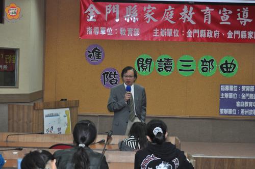 金門縣政府教育局、金門縣家庭教育中心主辦的推展家庭教育計畫「進階閱讀三部曲」研習活動,昨首場次在金門縣文化局登場,教育局長李再杭並期許大家養成終身閱讀習慣,來提昇思考能力與生活品質。 這項並由金門浯洲故事團協辦的「進階閱讀三部曲」研習活動,十二月十二日、十九日也將在原場地續舉辦,將分別由吳庭琲、陳晞如兩位講師,就「閱讀裡的生命教育」、「當兒童文學躍上大螢幕」主題進行主講。 昨首場研習,也吸引近百位有興趣的學校老師、家長、故事媽媽及對兒童、青少年閱讀有興趣的民眾報名參加。並聽取毛毛蟲兒童哲學基金會研究發展部主任、台灣小學語文教育學會理事陳鴻銘主講「閱讀理解與思考」。 主辦單位指出,全程參與三場研習活動者,核予九小時研習時數,並由主辦單位贈送禮品乙份鼓勵。而參加學員請於每場次活動當日上午八時三十分至九時至金門縣文化局三樓會議室辦理報到。 金門縣政府教育局辦理推展家庭教育計畫,目的係為推動「全家關機半小時,全家喜閱半小時」運動,培養家庭閱讀習慣,提昇思考能力與生活品質;並配合青少年閱讀歷程上的成長,提供與閱讀相關的輔導或協助,培養親子共讀習慣,增進親子情感與互動關係,健全家庭和諧美滿生活。 教育局也期藉推動家庭校園閱讀,結合學校閱讀志工、故事媽媽,協助學校閱讀活動,延伸家庭閱讀習慣。並以進階閱讀知能學習,促進對閱讀活動中包括語文、藝術與思考等多層次的了解與運用,提升閱讀品質、內涵與深度,營造多元豐富閱讀,奠定終身學習的基本能力。