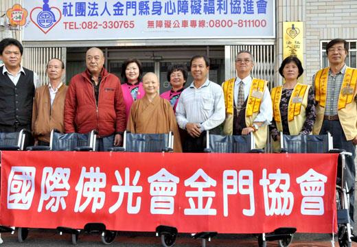 國際佛光會藉由贊助輪椅,讓「人間有愛」;一般家庭也可以捐贈不再使用的輪椅,追隨「佛光」,讓愛延伸! 國際佛光會中華總會「人間有愛‧佛光輪椅」活動昨天前進金湖,以「社團法人金門縣身心障礙協進會」及「金門縣身心障礙者家長協會」為贊助對象,共捐贈了十八台輪椅。 金門縣身心障礙者家長協會理事長陳東慶對國際佛光會的義行表示感謝;他表示,家長協會的輪椅可以對外提供借用,並希望擁有輪椅的家庭,一旦不需要再使用輪椅時,不要將已經不用或是已有損壞的輪椅當做廢棄物丟棄,可以把它送給家長協會,由協會請專人維修,重新利用,這樣就可以幫助更多需要的人。 國際佛光會中華總會「人間有愛‧佛光輪椅」贊助活動已經持續舉辦十多年;今年十一月第一梯次的輪椅贈送計畫數量是一百六十二台;致贈對象包括中華民國殘障聯盟、各醫療單位、財團法人佛光山慈悲社會福利基金會等;第一梯次贈送的單位涵蓋了金門、馬祖等地區。 國際佛光會中華總會的「輔導」永勤法師(金蓮淨苑住持)、督導楊清國、楊惠萍、副會長洪永善(烈嶼)、林淑桃(金沙)、李金鳳(金湖)、法師妙晟等,昨天把「佛光輪椅」致贈給金門縣身心障礙者家長協會和社團法人金門縣身心障礙協進會。 家長協會獲贈八台,由理事長陳東慶代表接受;身心障礙協進會獲贈十台,由理事長王清武代表接受。兩會分別致贈感謝狀給佛光會。 金蓮淨苑住持釋永勤表示,佛光會的會務內容包括:以教育培養人才;以文化弘揚佛法;以慈善福利社會;以共修淨化人心。「人間有愛‧佛光輪椅」的舉辦,就是以慈善福利社會的實踐方式之一,希望能拋磚引玉,讓更多人共同幫助需要幫助的人。 釋永勤對金門縣身心障礙協進會、金門縣身心障礙者家長協會的服務人員表示肯定,認為他們是救苦救難的「人間菩薩」。 金門縣身心障礙協進會目前有五千一百多個會員,理事長王清武表示,佛光會對協會非常關心,每年都有捐贈活動,讓他們感恩在心。 金門縣身心障礙者家長協會目前有九十幾個會員,會員服務的對象是以智能障礙為主的身心障礙者,範圍涵蓋全縣。理事長陳東慶表示,對有需要的人而言,輪椅是很重要的輔具-家長協會很珍惜每一台輪椅!他除了感謝佛光會的贊助之外,還籲請家有輪椅的民眾,不要把已經不使用的輪椅當做垃圾,可以送給家長協會,幫助更多需要輪椅的人。 陳東慶表示,家長協會有輪椅外借的服務(聯絡電話:337393),不需要收費,但須暫押保證金,等歸還輪椅時再全額奉還。 根據佛光會的說明,以慈善福利社會是佛光會的四大宗旨之一,「人間有愛‧佛光輪椅」的舉辦,是為了發揮菩薩精神,以實際行動關懷偏遠地區,讓佛光普照弱勢族群。 佛光輪椅由佛光會員籌資募集而成,希望藉由輪椅,讓身障者能超越身體上的障礙,實現他們想要完成的夢想;同時也希望拋磚引玉,讓各界共同關懷身障者的權益、福利;種善因,結善果;把愛與快樂散播出去,讓愛能超越種族、貧富、身體障礙,無限延伸。 國際佛光會成立於一九九一年二月三日;全世界已有百餘個國家或地區成立了總會或協會。創會會長是星雲大師,現任總會長是陳淼勝(現任南華大學校長)。佛光會員們所奉行的四句偈-「慈悲喜捨遍法界,惜福結緣利人天,禪淨戒行平等忍,慚愧感恩大願心。」也受到社會大眾的認同。