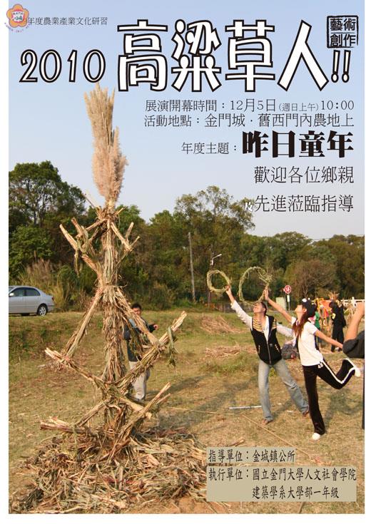 為推廣99年度農業產業文化研習活動,金城鎮公所將於明(五)日假金門城舊西門舉辦「2010高粱草人成果展示」活動,並以昨日童年為主題,將有放風箏、擊劍、套圈圈、老鷹抓小雞、釣魚、傳聲筒、打陀螺及捉蝴蝶等八項作品參展比賽,作品各組學生於現場進行展演及說明,藉此展現金門特有的高粱文化,達到良好的空間教學及社區參與目標。 這項由金城鎮公所指導,國立金門大學建築學系所執行的「2010高粱草人」活動,即將於明(五)日上午十時在金門城舊西門城內的農地舉行高粱草人成果展示活動,將有各組學生的現場展演及說明,屆時歡迎社區鄉親前往共襄盛舉,體驗金門農村產業生態的特色。 鎮公所指出,國立金門大學建築學系以「高粱草人製作比賽」參與金城鎮公所高粱文化節活動,今年已經是第四屆,除了使各地學生親身參與體會金門的農村產業生態特色,也活潑多元地展現金門特有的高粱文化,達到良好的空間教學及社區參與目標。 高粱草人成果展主題為『昨日童年』,執行計畫的特色是與建築設計課程相互結合,由國立金門大學建築學系江柏煒、林美吟、袁興言、陳書毅、李秀秀、孫靜梅、陳炳宏、陳啟明八位老師共同指導兩班將近120位的大一同學,從11月中旬開始,以三週時間完成由設計構想、說明草模、材料收集至現場製作的教學過程。 這項活動共完成放風箏、擊劍、套圈圈、老鷹抓小雞、釣魚、傳聲筒、打陀螺及捉蝴蝶等八項作品,達成了三項教學目標,包括藉由群體遊戲形態的分析。理解空間與活動原理與構成表現,以鄉土材料的觀察及應用,加上設計轉化手法激發創意。貼近社區空間,感受及回應建築設計對於真實社會的介入。