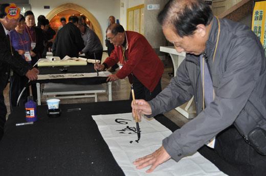 「翰墨情緣」!大陸浙江省江山市老人書畫協會一行,昨日於從台灣中轉準備走小三通回返同時,特別和金門縣書法學會進行一場書法揮毫交流,兩會均希望透過交流切磋書藝,並促進兩地友誼。 浙江省江山市老人書畫協會一行計三十五人,是由協會會長王厚恭帶領,於十一月三十日從廈門走小三通到金門,再中轉赴台,前往台中、南投、嘉義、台北等地進行走訪和旅遊。 該一行昨日下午三時於前進金門縣文化局大廳時,也受到文化局課長周祥敏、金門縣書法學會理事長洪明燦、前理事長陳添財及多位書法學會會員歡迎,並相互交換禮物和進行書法現場揮毫交流、聯誼。 王厚恭對於能有機會和金門書法界朋友切磋中國書法書藝,感到相當高興;洪明燦則對於能「以書會友」、促進兩地友誼,也覺得機會難得。 在以客為尊的前提,浙江省江山市老人書畫協會多位書法家,也率先上場揮毫,會長王厚恭也書寫「翰墨情緣」墨寶贈送金門縣書法學會;金門縣書法學會理事長洪明燦和唐敏達、洪松柏、陳添財等人,也提筆揮毫,讓滿室書藝飄香。