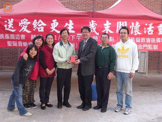 基督教更生團契金門區會於十一月廿八日舉行「送愛給更生」歲末關懷活動,金城鎮公所配合辦理跳蚤巿場義賣活動,獲得廣泛迴響與支持,總計義賣所得計新台幣3000元,鎮長石兆瑉特別代表員工捐贈給基督教更生團契金門區會,以作為關懷金門監獄收容人愛心公益活動,由金門基督教會牧師李坤南代表接受,並向石鎮長表達感謝之意。 基督教更生團契金門區會於十一月廿八日(週日)下午假金門基督教會後廣場舉辦「送愛給更生」歲末關懷跳蚤園遊會,希望喚醒社會大眾的愛心籌募關懷金門監獄受刑人之愛心基金,以實際行動關懷金門監獄受刑人的情感和心靈需要,幫助受刑人重新建立正確人生觀與信仰。 金城鎮公所結合愛心公益活動辦理跳蚤巿場義賣活動,號召鎮公所員工捐贈可堪用而自己已經不再使用的物品,捐贈品包羅萬象,有鞋架、鐵板燒烤盤、皮包、小玩偶…等品項,短短二個多小時的義賣活動,就獲得廣泛迴響與支持,義賣所得總計2970元,鎮公所並湊足新台幣3000元整數以作為善款捐贈。 昨日上午九時許由鎮長石兆瑉、社會課長蔡木川將義賣所得經費新台幣3000元送往金門基督教會,全部捐贈給基督教更生團契金門區會,並受到教會牧師李坤南及教會同仁的歡迎與感謝。 鎮長石兆瑉表示,為鼓勵鄉親關懷受刑人,透過公所員工發揮愛心,將可堪用而不再使用的物品捐贈做為跳蚤巿場義賣商品,讓參與活動的民眾自由選購需要的物品,所得則捐給更生團契金門區會。 石鎮長指出,本次義賣活動未賣出的物品,將於12月12日家扶中心的「歲末寒冬送暖愛心園遊會」活動,鎮公所續辦理「環保心、公益情」跳蚤巿場義賣活動,義賣所得將全數捐給家扶中心,他並歡迎各界踴躍捐贈可堪用物品、衣服等,做為愛心義賣之用,詳情可洽金城鎮公所(電話:325057)。