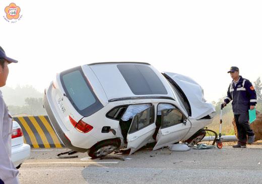 狗來急,車跳牆!昨天早晨,一隻狗突如其來竄出馬路,一部BMW(寶馬)的駕駛人疑似為了閃避,撞倒了燈桿和電信桿,騎上了環島東路后園段的彎道護欄,車頭全毀;不過,由於六個輔助氣囊全開,發揮功能,駕駛人並沒有外傷。 據金湖分局一組組長翁生乃、勤指中心主任蔡顯群及警備隊車禍處理組的陳宗慶等人的說明,這起車禍只有車損,沒有人受傷;肇禍的原因疑似是有野狗突然橫越馬路,讓駕駛人應變不及。駕駛人並未酒駕;事發後自行攔下路過的機車離去。 為了預防交通事故,警方轉達金湖分局長的呼籲,請駕駛人在危險路段減速慢行,並切實繫好安全帶,才能讓輔助氣囊發揮作用。此外,野狗亂竄也是交通安全的隱憂,警方建議相關單位能注意這方面的問題。 后園段大小車禍頻仍,居民們表示,村子缺少活動的空間,他們想要活動一下,很容易出事,之前有一位阿婆就是為了散步求健康,反而被車撞死;因此,希望政府能在后園規劃適當的運動空間,讓居民不必冒險進行活動。 昨天這起車禍發生在早上七點半左右;因為衝撞被連根拔起的路燈,在上午九點四十幾分就在養工所所長董漢耀的指揮下完成更新;所方表示,原則上會向肇事者求償。