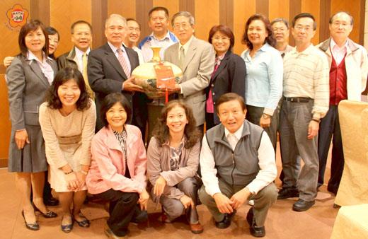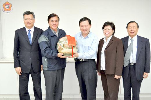 楊水詠/圖文 行政院經濟建設委員會組長王智輝(右三),即將榮陞農委會水保局農村建設組組長一職;他隨經建會副主任委員黃萬翔(左一)陪同監察委員沈美真(右二)和杜善良(右一)來金訪視離島建設基金補助計畫執行情形和參與座談會。在會中,縣府主任秘書盧志輝(左二)代表縣長李沃士贈送官窯金門陶瓷廠燒製精美花瓶一隻,祝他:「智啟地方事務,輝煌離島建設」,在場與會人員也報以掌聲和祝福,場面十分溫馨喜氣。