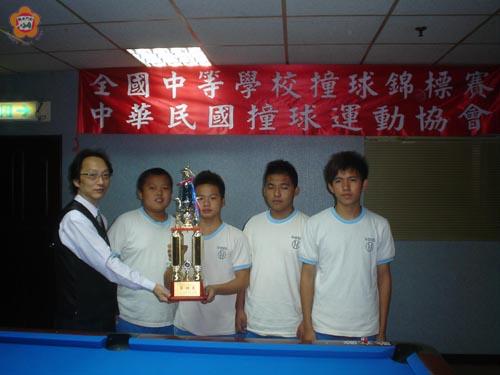金城國中撞球代表隊赴台參加99學年度全國中等學校撞球錦標賽花式9號球個人組及團體組比賽,榮獲團體組第四名,校長楊瑞松看到同學們平日努力練習而獲得的成果感到與有榮焉,期勉他們日後繼續努力,為金門縣爭光。 金城國中撞球代表隊日前由學務主任陳德泉老師帶隊赴台參加99學年度全國中等學校撞球錦標賽花式9號球個人組及團體組比賽,第一場比賽是首次參加全國性比賽,難免有些怯場,不幸輸給高市旗津國中,接著連續贏了北縣新莊國中及新竹員東國中而進入前四強,於爭三四名時不幸落敗,榮獲團體組第四名並領回獎盃。陳德泉說,看到學生有好的表現也相當高興。這次的全國賽選手雖然緊張,但希望學生不要有壓力,他說:「讓孩子去體會那些經驗大於獎盃的意義。」 金城國中撞球代表隊由校長楊瑞松擔任領隊:教練陳德泉主任。個人組隊員:翁祥雲、陳文豪,團體組:唐榮程、陳文凱、楊秉倫、葉季霖。 陳德泉除感謝校長的大力支持,導師們的鼓勵,更要感謝金門縣政府的經費支援,金門農工陳水芳校長及陳國生老師等的各方面協助。特別要感謝家長會副會長張志福先生義務提供場地供學生訓練及義務指導學生之球技,也要感謝體育組長張淵盛老師及楊清德幹事於放學後及午休時間陪同學生練球及接送等行政支援,犧牲平日和假日的時間訓練選手,以耐心和愛心積極參與,尤其要感謝中華民國撞球運動協會理事長 永輝先生的大力支持及鼓勵。