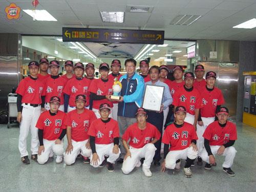 由金門農工組成的金合利鋼刀慢速壘球隊日昨赴台參加「第八屆總統盃慢壘全國總決賽」,結果擊敗群雄,勇奪高中組冠軍凱旋榮歸,身兼金門縣慢壘運動委員會主委的金城鎮長石兆瑉前往機場接機,對於他們的表現也感到欣喜及驕傲。 由中華民國慢速壘球協會舉辦的「第八屆總統盃慢壘全國總決賽」於十月卅、卅一日兩天在彰化縣、嘉義市及台南市等地球場舉行,金門農工慢壘隊應邀參賽,與包括彰化崇實高工、屏東枋寮高中、台東關山工商、雲林正心高中、台中僑泰中學、新竹仰德高中、台南陽明工商、花蓮高農及嘉義輔仁中學等隊競逐高中組冠軍寶座。 金門農工於卅日順利打進四強後,卅一日以15:7擊敗台東關山工商,進入冠軍賽,並對上台南縣陽明工商,一開打雙方火力全開,一局各得1分互不相讓,三下金門農工擊出4支安打再添2分領先,四下金門農工連續5支安打不但再下3分,也讓陽明陣腳大亂出現失誤,又追加3分。五上金門農工操之過急讓陽明獲保送後靠二壘打扳回1分,幸賴投手邵凡嘉接到反彈球傳一壘黃智鴻,再傳捕手林俊鴻演出再見雙殺捧盃凱旋。 此次的總統盃慢速壘球邀請賽,金門農工除了榮獲高中組冠軍外,也囊括打擊獎:許中洋、全壘打獎:張穎台、MVP:黃智鴻、投手獎:邵凡嘉等獎項。 這次金門農工表現優異,身兼金門縣慢壘運動委員會主委的金城鎮長石兆瑉也表示相當欣喜,對於球員奮力拚戰的精神可嘉,以及優異的表現,他也覺得相當驕傲。 石兆瑉表示,金門慢壘運動蓬勃發展,金城鎮公所舉辦的金城盃慢壘邀請賽,明年也將研議每隊需至少一名女性隊員參加,並制定相關規則,希望更多的女性投入慢壘運動,並提倡國民動態休閒活動培養國民終身運動習慣,他也希望大家攜手合作,「打出健康、打出幸福」從運動中開創新的樂趣活力。 本次參加總統盃慢速壘球邀請賽成員有,領隊石兆瑉、經理梁章興、教練吳志偉及黃國偉,隊員:鄭子皓、邵凡嘉、董仲恩、張光榕、張穎台、許中洋、陳丕宏、蔡名遠、鄭智銘、謝昇瑋、黃智鴻、陳昭文、林俊鴻、莊昂瑾、李卓倫、吳宇軒、林柏勛、王先毅、戴紹恆、翁嘉隆。