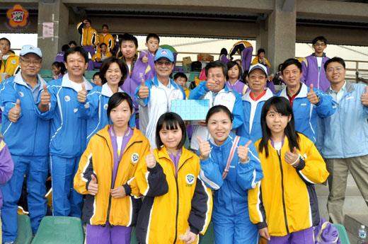 楊水詠/圖文 海洋仙洲,精采金門。金湖鎮鎮民代表會主席呂瑞泰同副主席謝鴻儒,昨天下午率領全體鎮代表、職員一行,帶著運動飲料前往縣立體育場,探慰金湖國中,以及開瑄、柏村、正義、多年和金湖國小參賽的選手,給予加油打氣,爭取運動場上佳績,為學校和金湖學區爭光,並聚在一起,比出大拇指,高聲喊出:「讚啦,我們一定贏!」