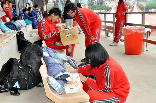 楊水詠/圖文 運動場上,選手全力衝刺,在震天價響的加油聲中,跑出、跳出、擲出好成績來。尚未上場一展身手,身穿色紅運動服的國立金門高中選手,鬧中取靜,以紙箱和座椅為書桌,坐著及蹲著,認真的做起學校平時考的英文習題,並與一旁的同學同時切磋。運動不忘讀書,未來必是允文允武的金門好青年!